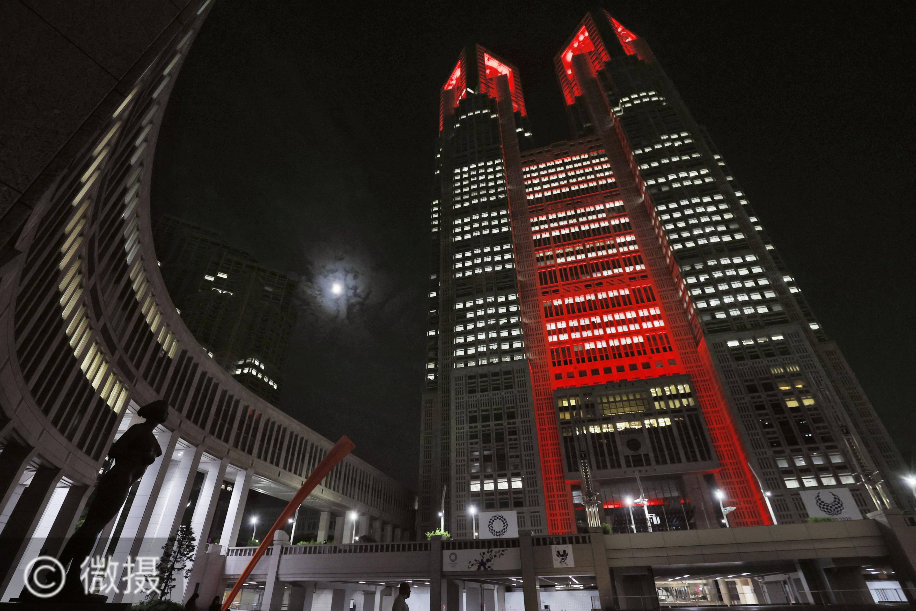 6月2日,日本东京都厅大楼点亮红色灯光,配合发出“东京警报”。据日本广播协会(NHK)电视台截至2日21时17分的统计,日本新增新冠确诊病例51例,累计17000例。当晚,东京都首次发出了“东京警报”,提醒民众注意避开“密闭”“密集”“密切接触”的高风险环境。新华社/共同社