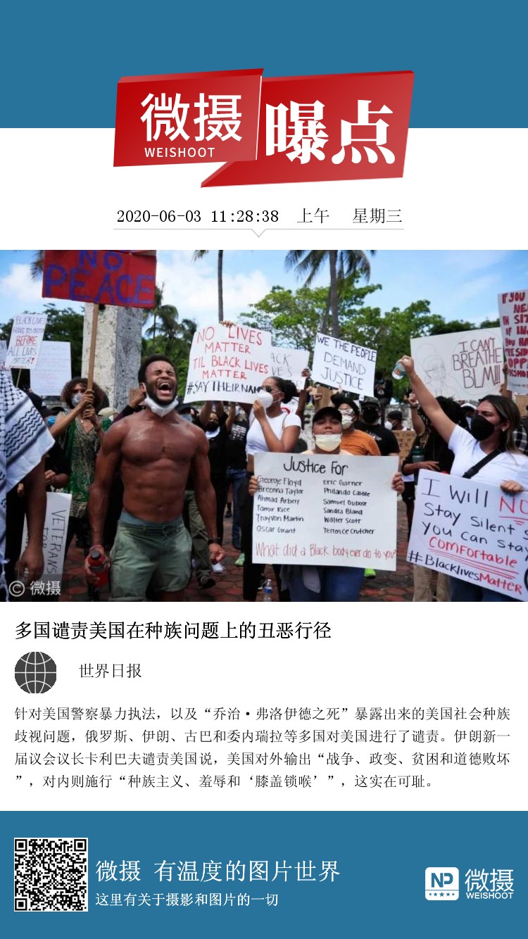针对美国警察暴力执法,以及“乔治·弗洛伊德之死”暴露出来的美国社会种族歧视问题,俄罗斯、伊朗、古巴和委内瑞拉等多国对美国进行了谴责。伊朗新一届议会议长卡利巴夫谴责美国说,美国对外输出“战争、政变、贫困和道德败坏”,对内则施行“种族主义、羞辱和‘膝盖锁喉’”,这实在可耻。