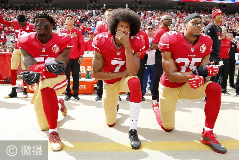 旧金山49人队球员Eli Harold,Colin Kaepernick和Eric Reid在2016年国歌中跪下以抗议警察的野蛮和种族主义。“屈膝”变得与1968年汤米·史密斯和约翰·卡洛斯在奥林匹克主席台上举起的拳头黑色力量致敬一样。这也使32岁的卡佩尼克失去了自己足球生涯。