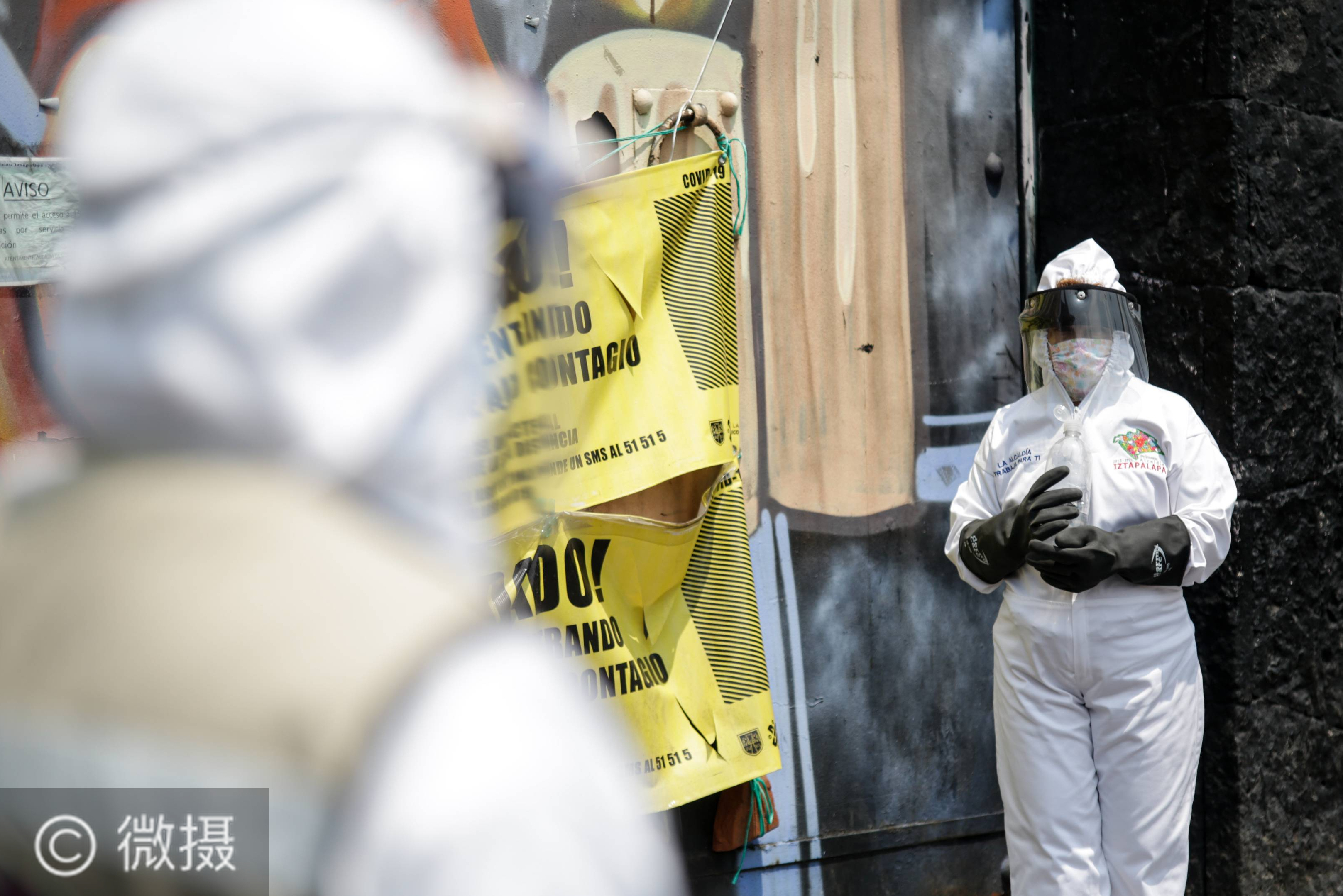 6月1日,在墨西哥首都墨西哥城的一处墓地,工作人员身着防护装备在入口为民众提供酒精消毒洗手液。据墨西哥卫生部1日公布的新冠疫情数据显示,该国累计确诊病例93435例,累计死亡10167例。 新华社发(弗朗西斯科·卡涅多摄)