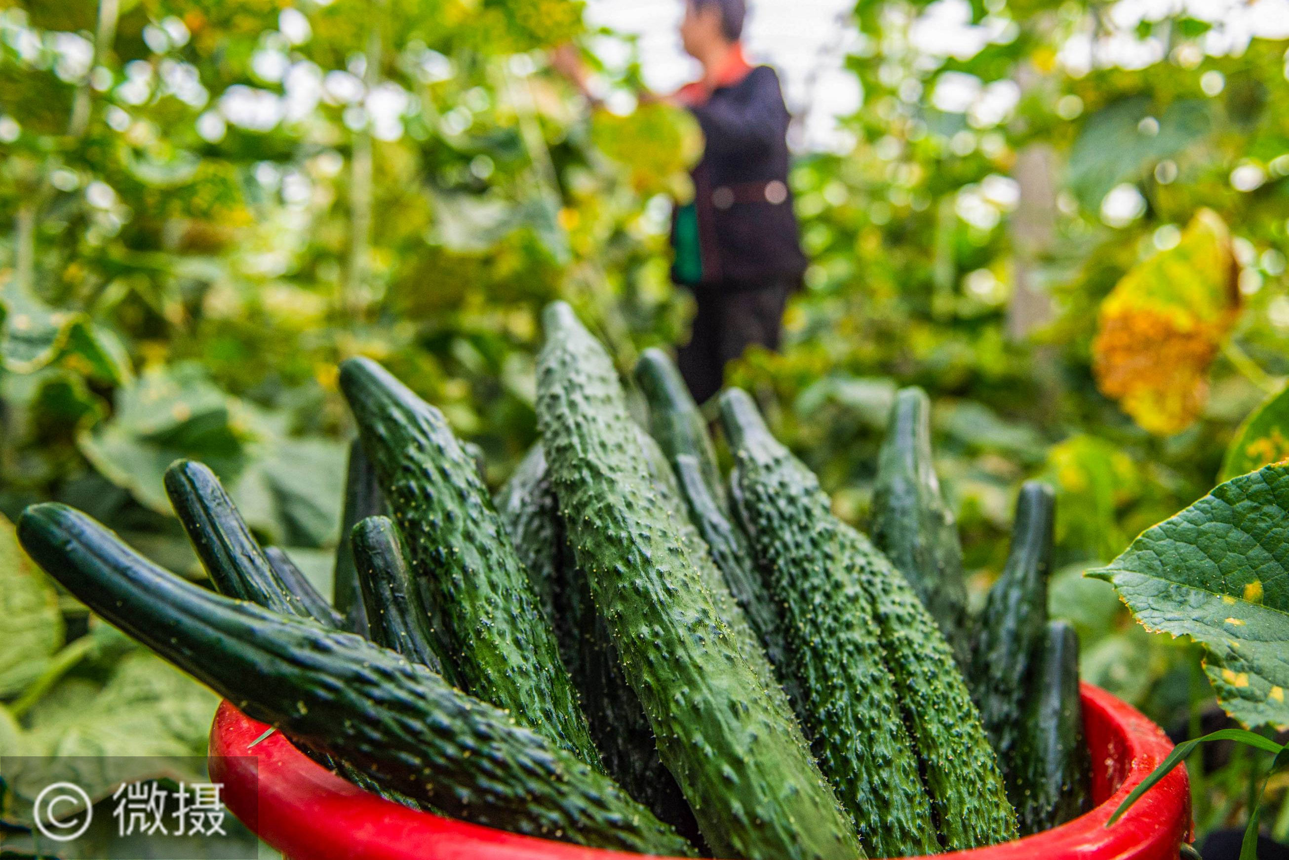 6月2日,枣强县恩察镇郭堂村的菜农在展示采摘的黄瓜。近年来,河北枣强县着力发展大棚瓜菜规模种植,依托合作社,连通菜农与商超,实现瓜菜直供商超,减少流通环节,提高农产品附加值,助力脱贫攻坚。目前,该县已发展大棚瓜菜5万余亩,与县内外200余家超市签订供货合同。新华社记者 李晓果 摄