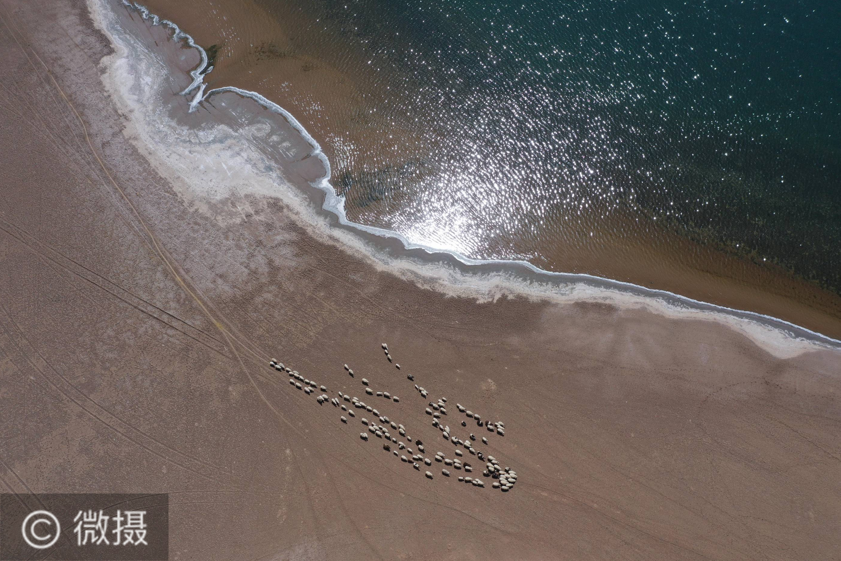 大漠深处 群湖竞艳。5月31日,羊群在巴丹吉林沙漠音德日图湖湖畔休憩(无人机照片)。内蒙古自治区巴丹吉林沙漠腹地分布着形状各异的湖泊。湖泊点缀黄沙之中,成为别致的风景。新华社记者 徐钦 摄