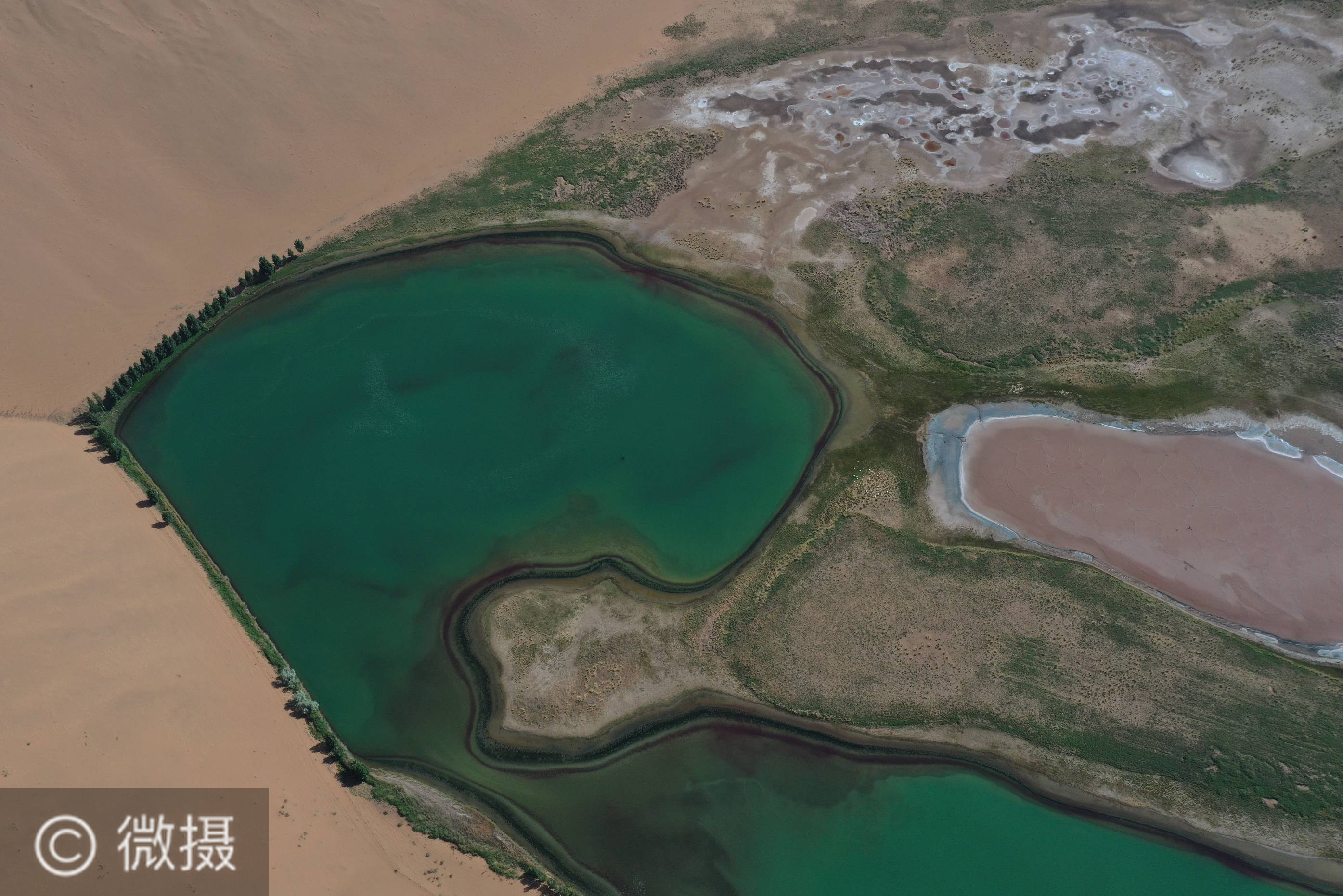 大漠深处,群湖竞艳。这是5月29日拍摄的巴丹吉林沙漠的诺尔图湖(无人机照片)。内蒙古自治区巴丹吉林沙漠腹地分布着形状各异的湖泊。湖泊点缀黄沙之中,成为别致的风景。 新华社记者 徐钦 摄
