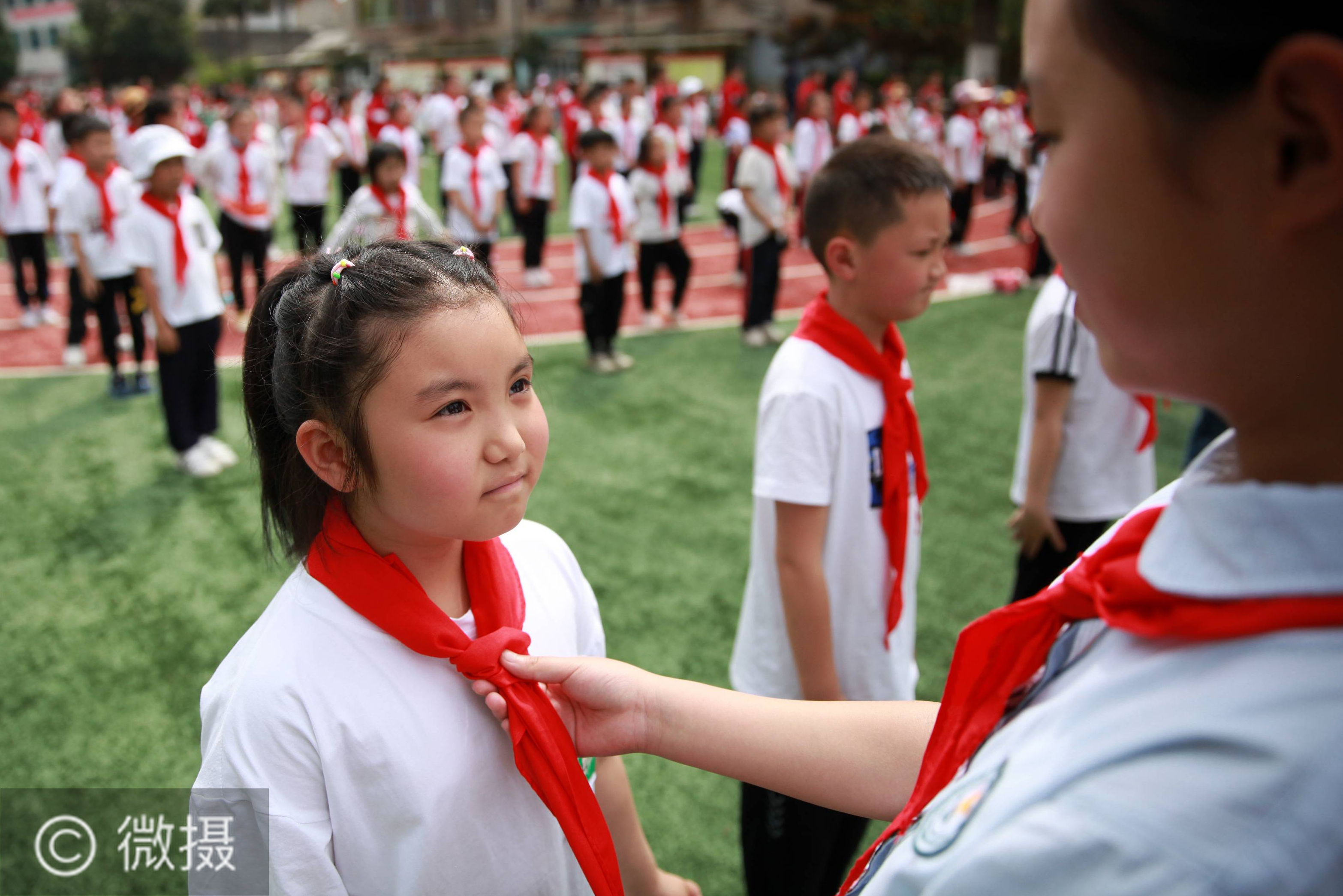 六一,我入队了。 6月1日,在贵州省毕节市黔西县第一小学,高年级学生为新队员佩戴红领巾。当日是“六一”国际儿童节,一些小学举行少先队入队仪式,让学生们度过一个有意义的节日。新华社发(史开心摄)
