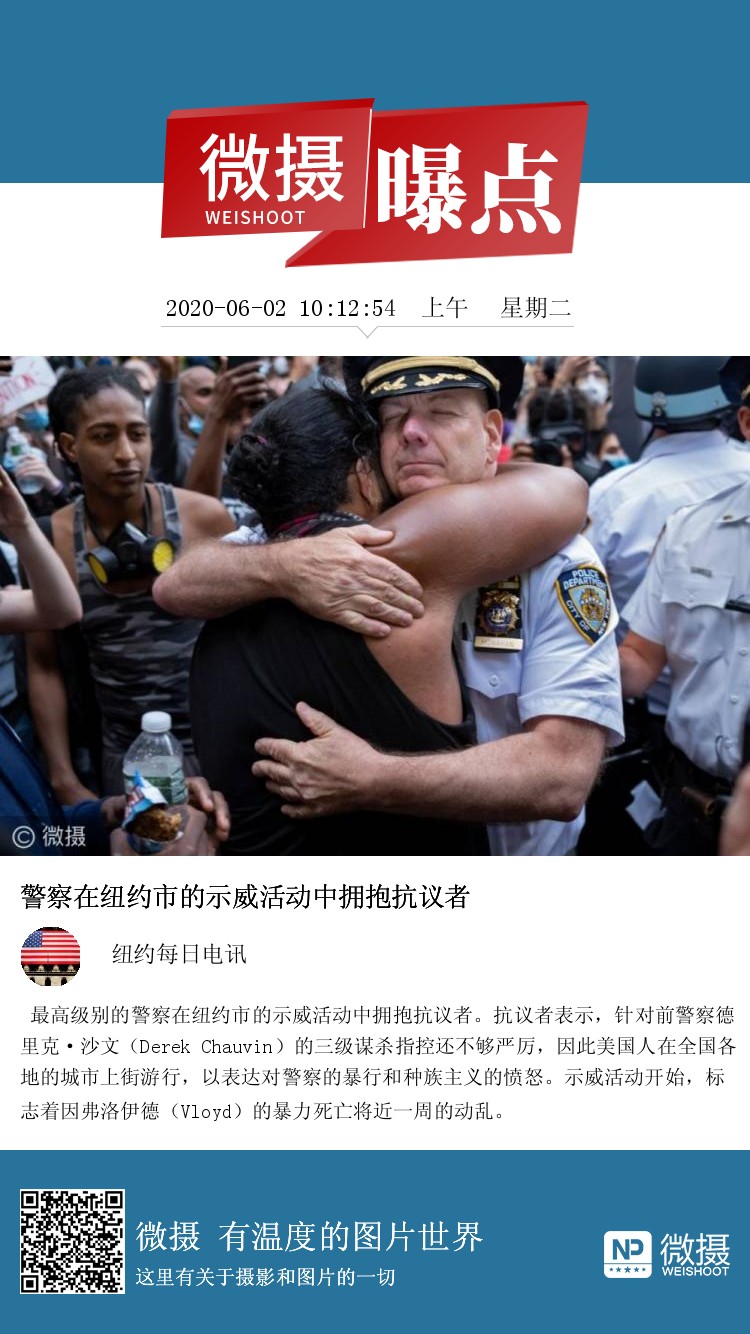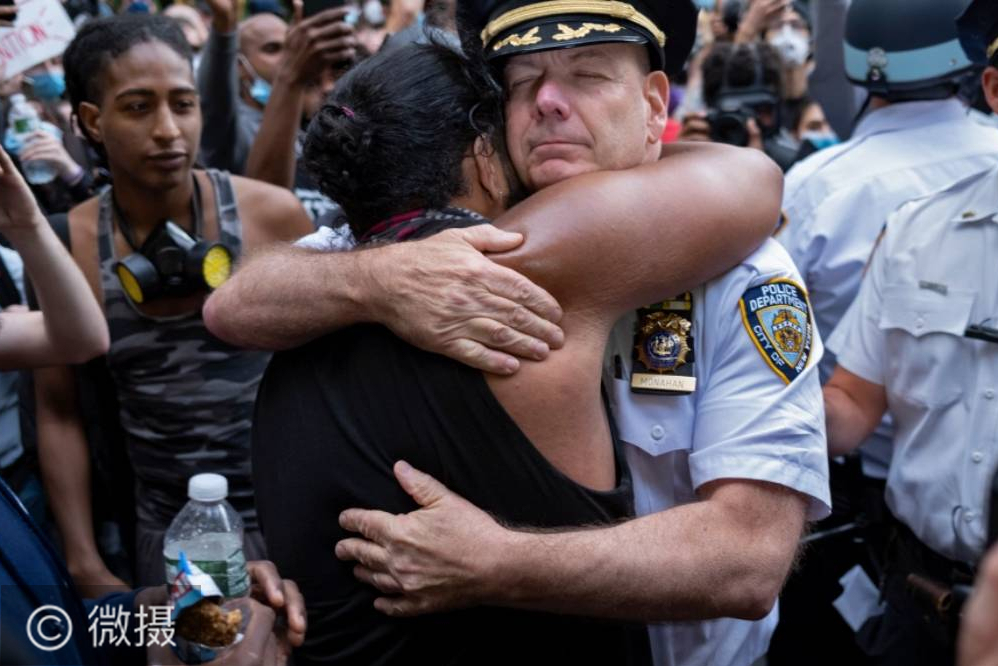 最高级别的警察在纽约市的示威活动中拥抱抗议者。抗议者表示,针对前警察德里克·沙文(Derek Chauvin)的三级谋杀指控还不够严厉,因此美国人在全国各地的城市上街游行,以表达对警察的暴行和种族主义的愤怒。示威活动开始,标志着因弗洛伊德(Vloyd)的暴力死亡将近一周的动乱。