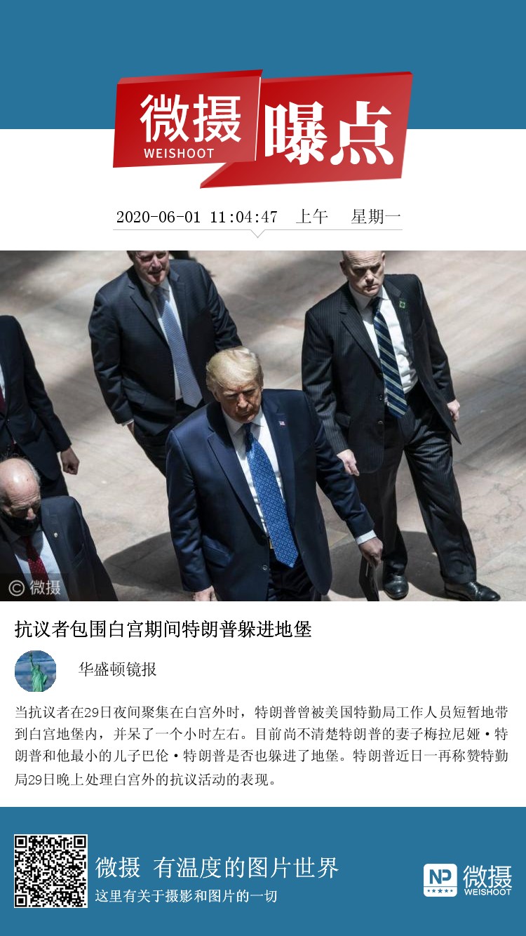 当抗议者在29日夜间聚集在白宫外时,特朗普曾被美国特勤局工作人员短暂地带到白宫地堡内,并呆了一个小时左右。目前尚不清楚特朗普的妻子梅拉尼娅·特朗普和他最小的儿子巴伦·特朗普是否也躲进了地堡。特朗普近日一再称赞特勤局29日晚上处理白宫外的抗议活动的表现。