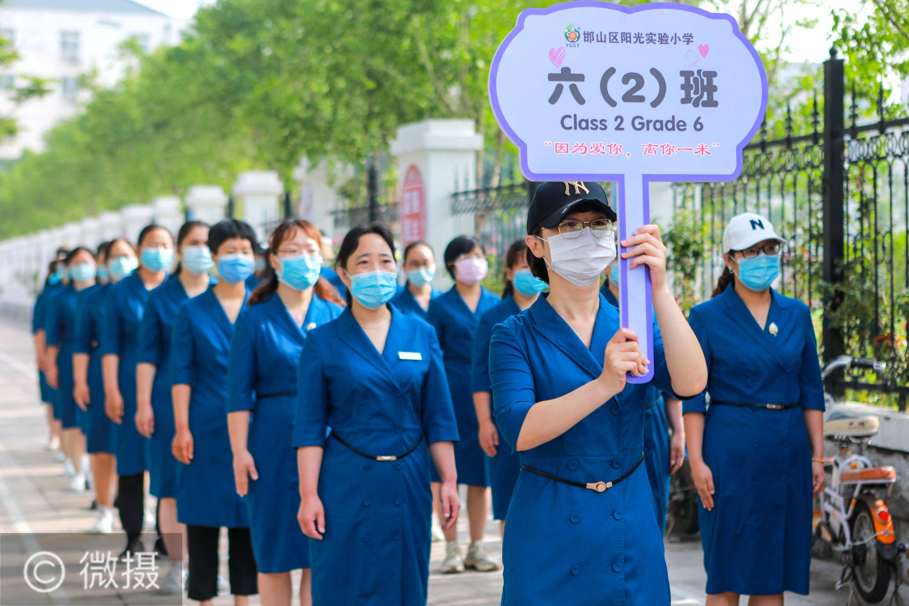 5月31日,邯郸市邯山区阳光实验小学教师在演练中模拟学生排队入校。当日,河北省邯郸市邯山区教育部门组织开展小学返校复学演练,体温异常应急处理、校园防疫消杀等环节,保障师生安全复课。河北省小学六年级6月1日起复学复课,小学四、五年级6月8日起复学复课。新华社记者 王晓 摄