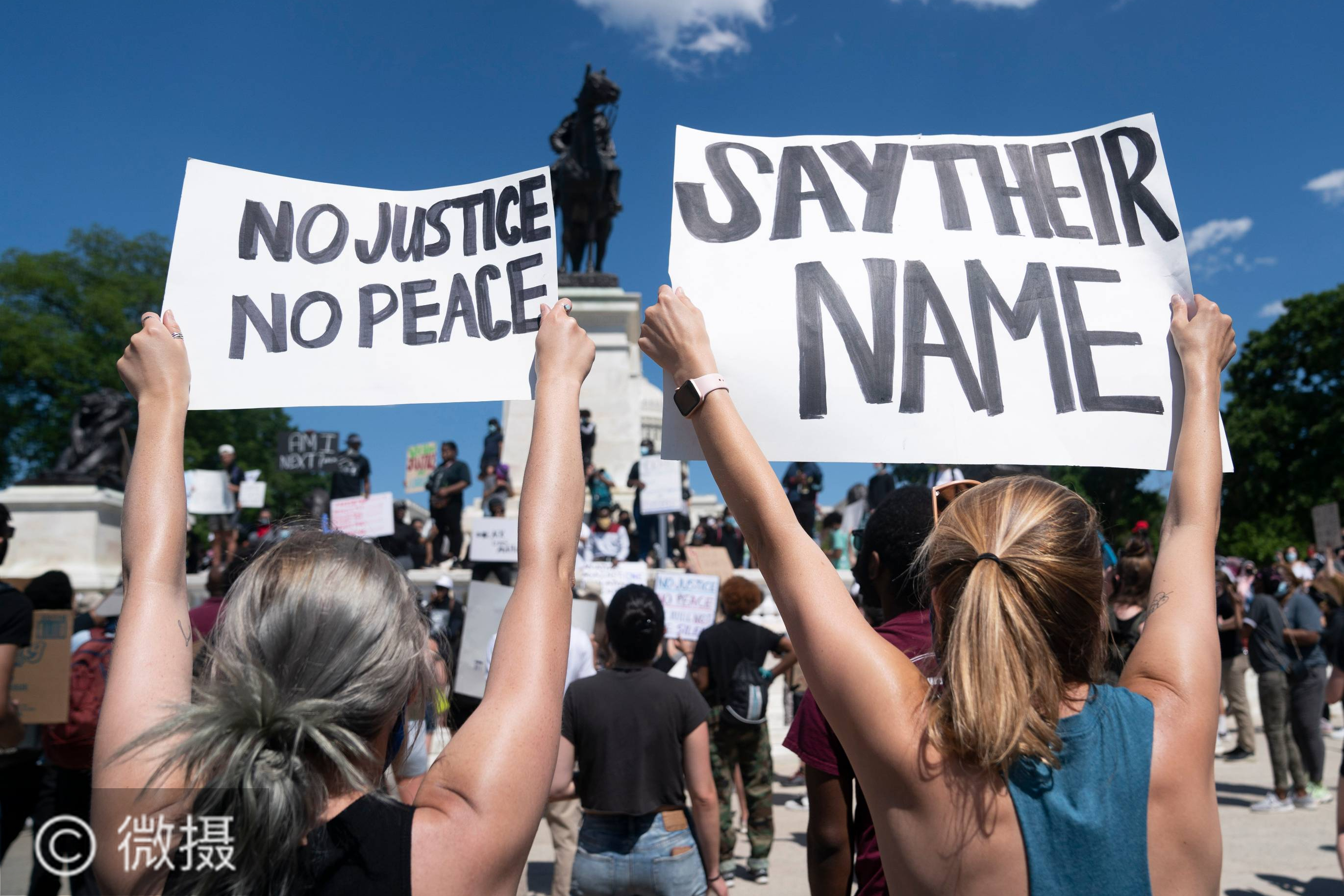 5月30日,在美国首都华盛顿,人们手持标语参加抗议活动。由美国明尼苏达州明尼阿波利斯市警察执法失当致非裔男子乔治·弗洛伊德死亡一事在当地引发的抗议活动30日蔓延至美国20多个州30多个城市。新华社记者 刘杰 摄