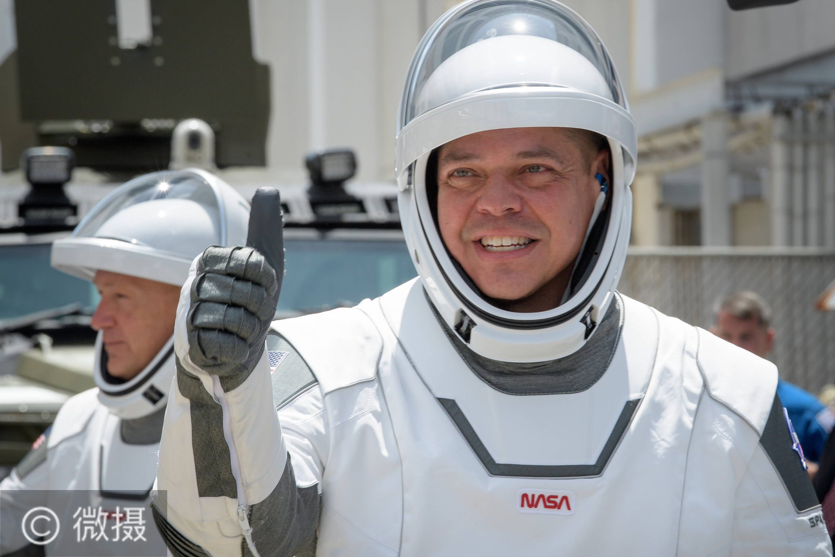 5月30日,在美国佛罗里达州肯尼迪航天中心,美国宇航员罗伯特·本肯(右)和道格拉斯·赫尔利准备前往39A发射台。美国太空探索技术公司的“龙”飞船30日首次进行载人试飞。这是自2011年以来美国首次使用国产火箭从本土将宇航员送往国际空间站。新华社发(美国国家航空航天局供图)