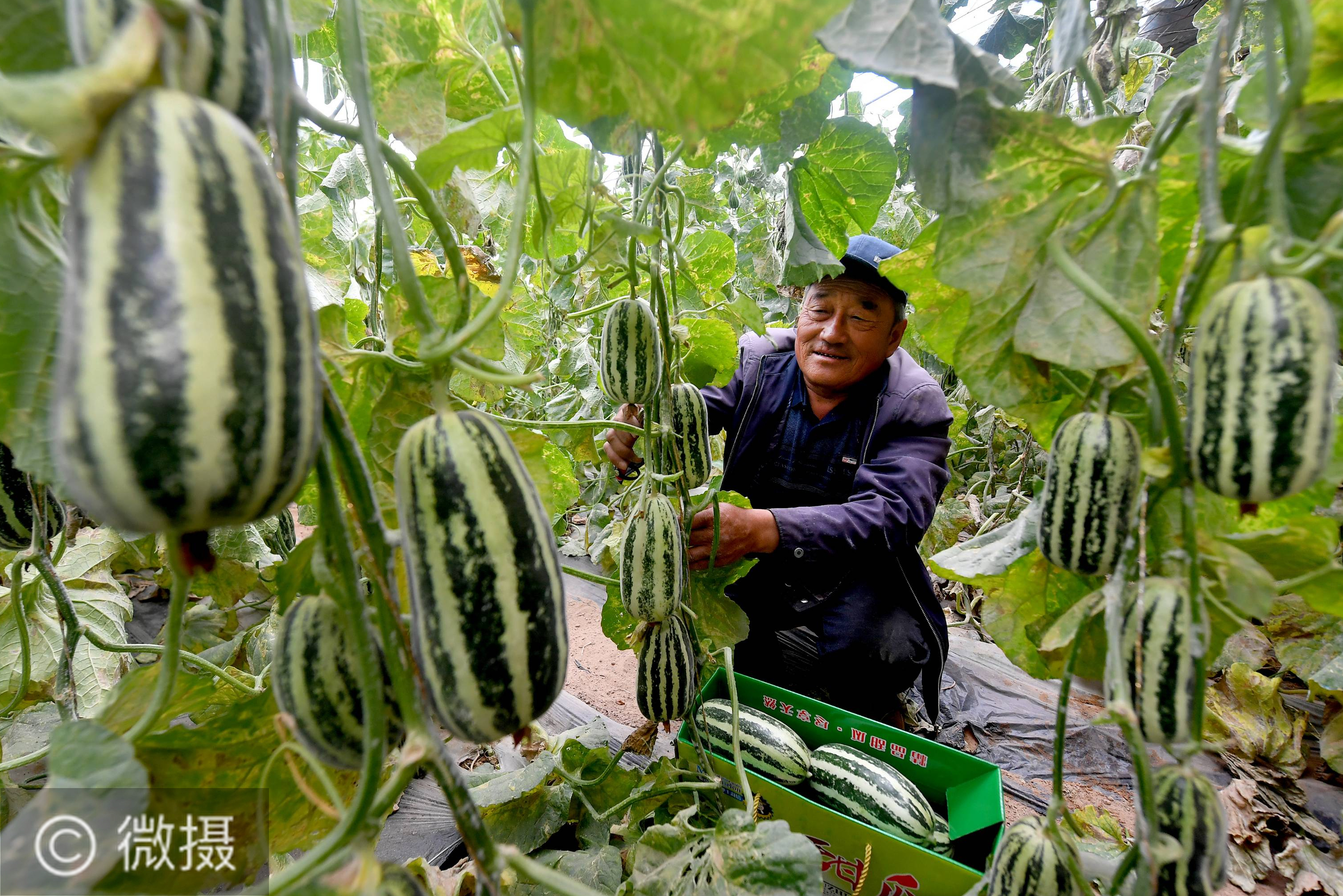 5月29日,陕西省靖边县东坑镇陆家山益农合作社人员在采摘大棚瓜果。陕西省靖边县东坑镇地处毛乌素沙漠南缘,四季分明、光照充足、昼夜温差大,是国内高寒冷凉蔬菜的重要种植地。 新华社记者 刘潇 摄