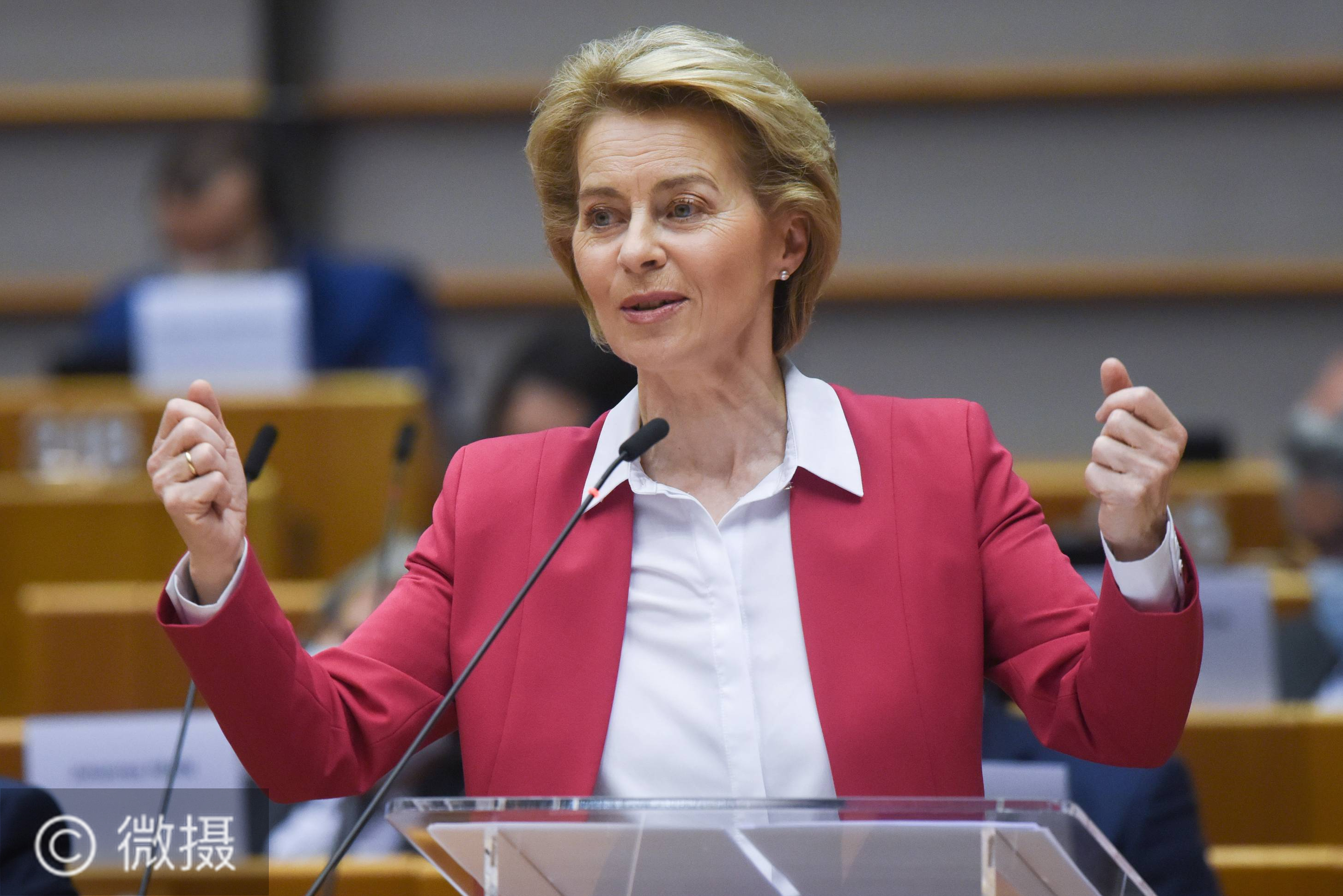 5月27日,在比利时布鲁塞尔的欧盟总部,欧盟委员会主席冯德莱恩在欧洲议会全会上发言。欧盟委员会27日提议通过发债方式筹集资金以设立总额为7500亿欧元的“恢复基金”,用于帮助欧盟成员国在新冠疫情后重建经济。新华社发(欧盟供图)