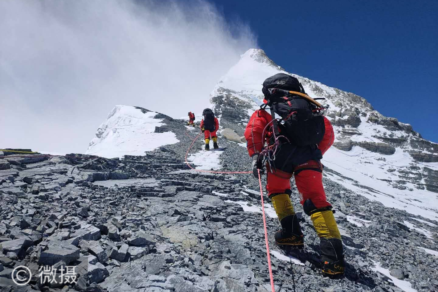 微摄图播|2020珠峰高程测量(17):5月26日,修路队员将攀登路线打通至珠峰峰顶。当日16时35分,6名修路队员将攀登路线打通至珠峰峰顶,即把路绳铺设至珠峰峰顶,为登顶测量打下良好基础。新华社发 (多吉次仁摄)