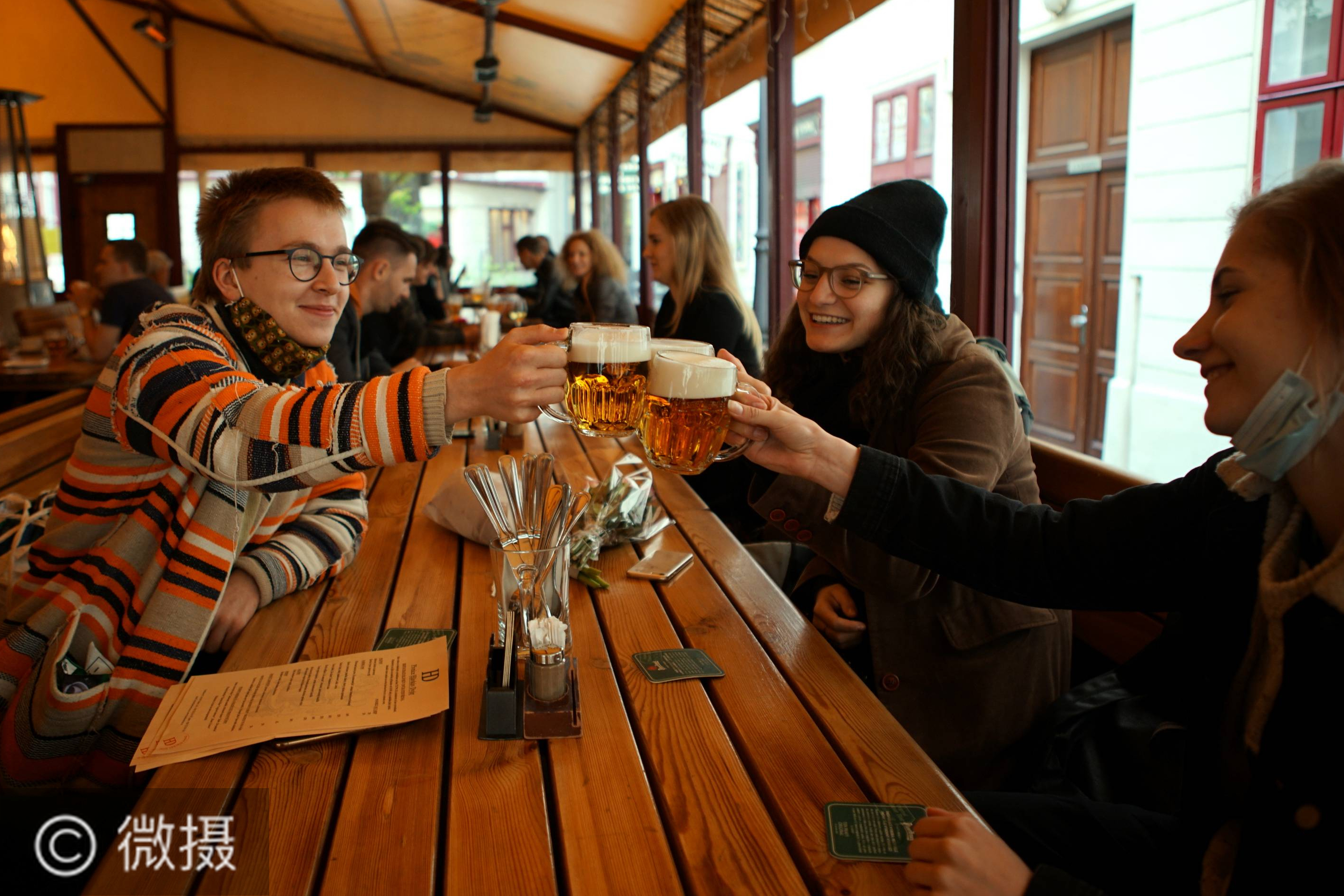 捷克进一步放松限制性措施。5月25日,人们在捷克布拉格一家餐厅碰杯。捷克25日进一步放松应对新冠疫情的限制性措施,因疫情而关闭的小学开始复课,餐馆也被允许开放室内部分。新华社发(达娜·科什奈洛娃摄)