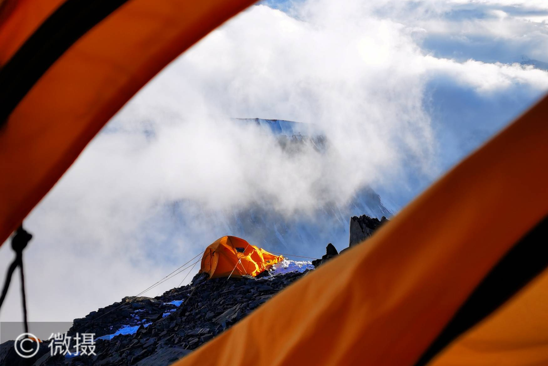 微摄图播|2020珠峰高程测量(17):5月26日早晨拍摄的珠峰海拔7790米的二号营地。珠峰海拔7790米的二号营地位于“大风口”上方的冰岩混合地带斜坡之上。大风是这个营地的特色,气温可低至零下20摄氏度以下。新华社特约记者 扎西次仁 摄