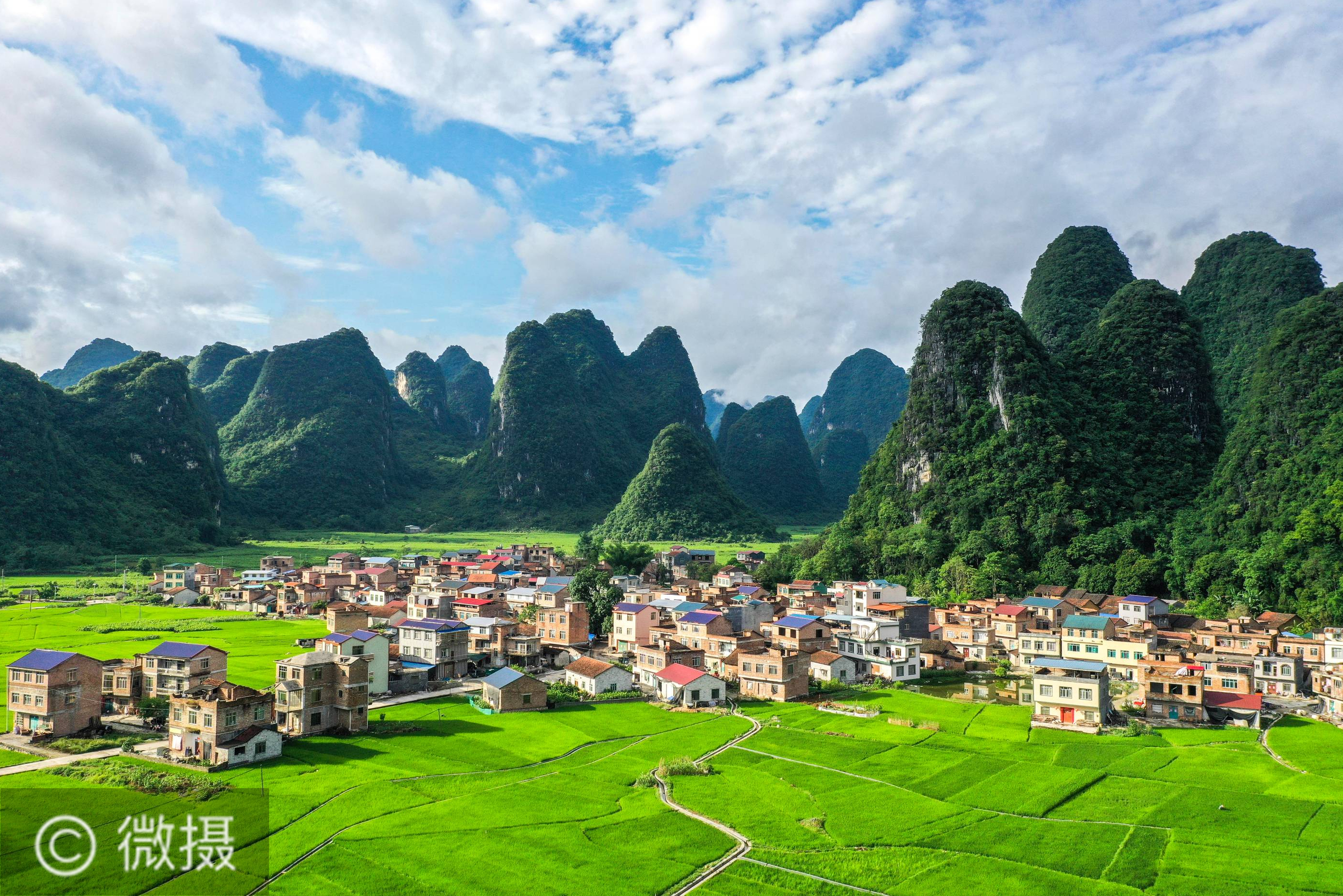 广西环江:夏日田园美。这是广西环江毛南族自治县大才乡重楼村夏日田园景色(5月25日摄,无人机照片)。初夏,雨后初霁的广西环江毛南族自治县大才乡重楼村绿意盎然,田园如画。新华社记者 曹祎铭 摄