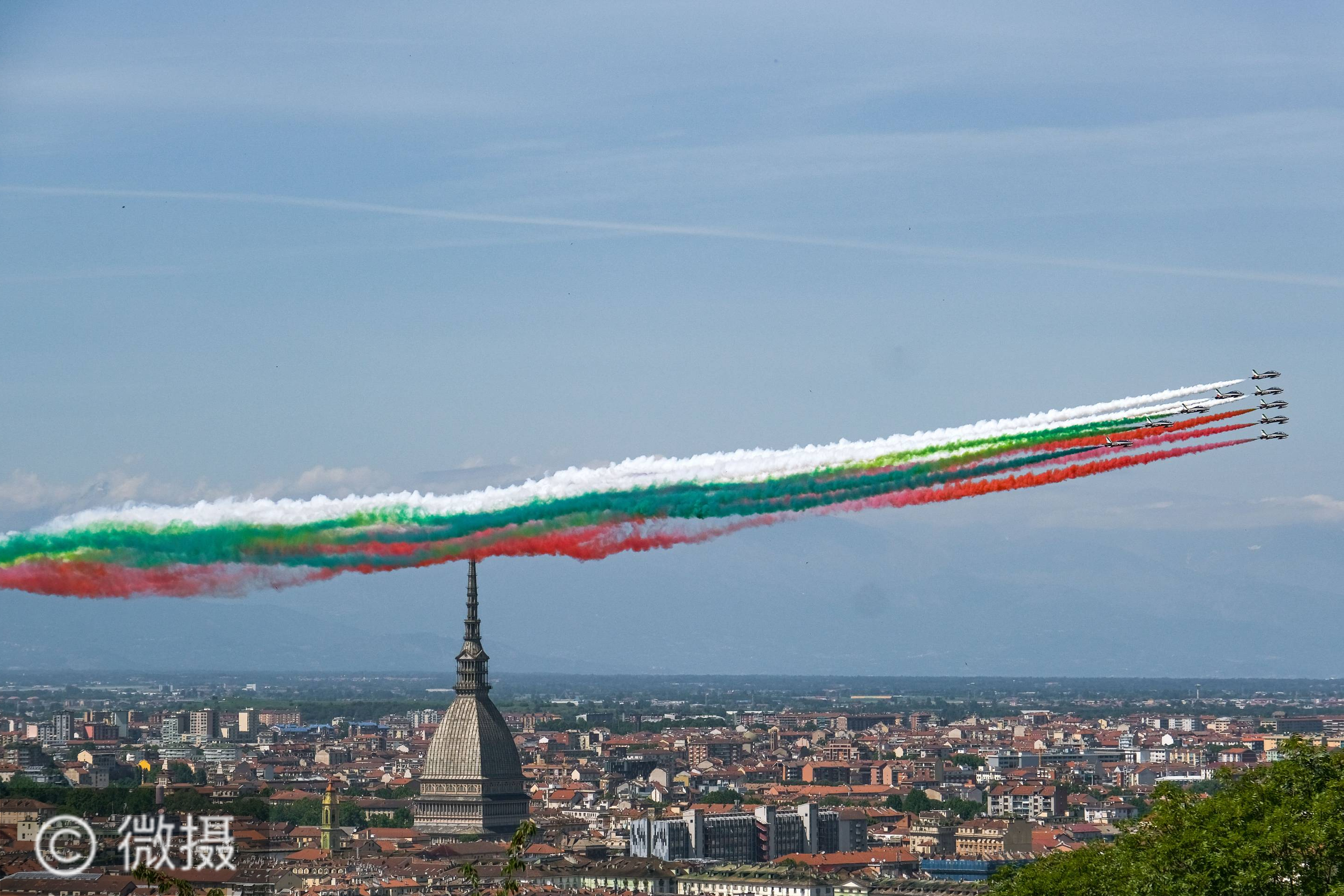 5月25日,意大利空军“三色箭”飞行表演队从都灵上空飞过。从25日起,意大利“三色箭”飞行表演队在意大利多个城市举行飞行表演,庆祝即将到来的6月2日意大利“共和国日”,同时激励民众团结抗疫。新华社发(费代里科·塔尔迪托摄)