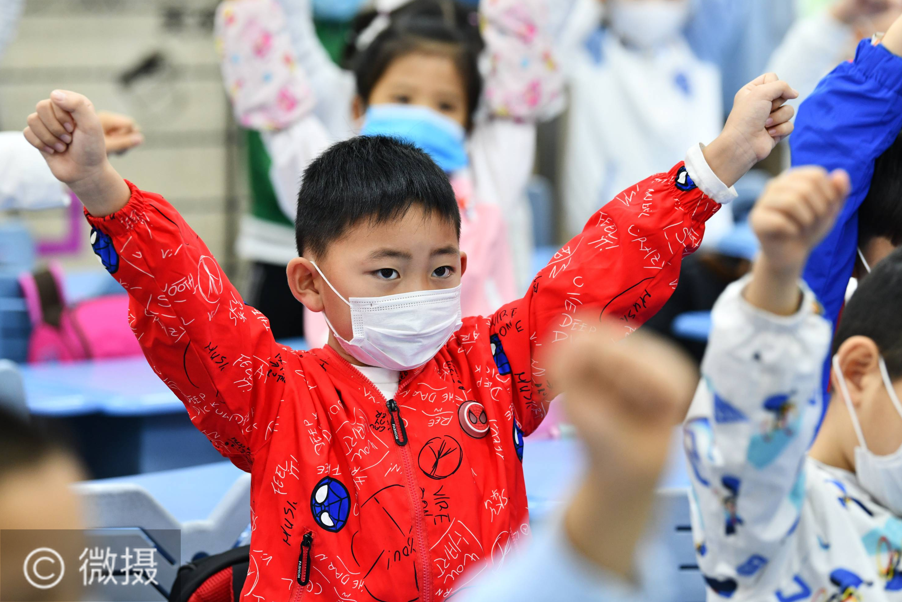 5月25日,贵阳市南明区苗苗实验学校的学生在做室内课间操。当日,根据贵阳市统一安排,贵阳市小学开始陆续复学。由于疫情原因,学生们不得不戴口罩上课。 新华社记者 杨文斌 摄