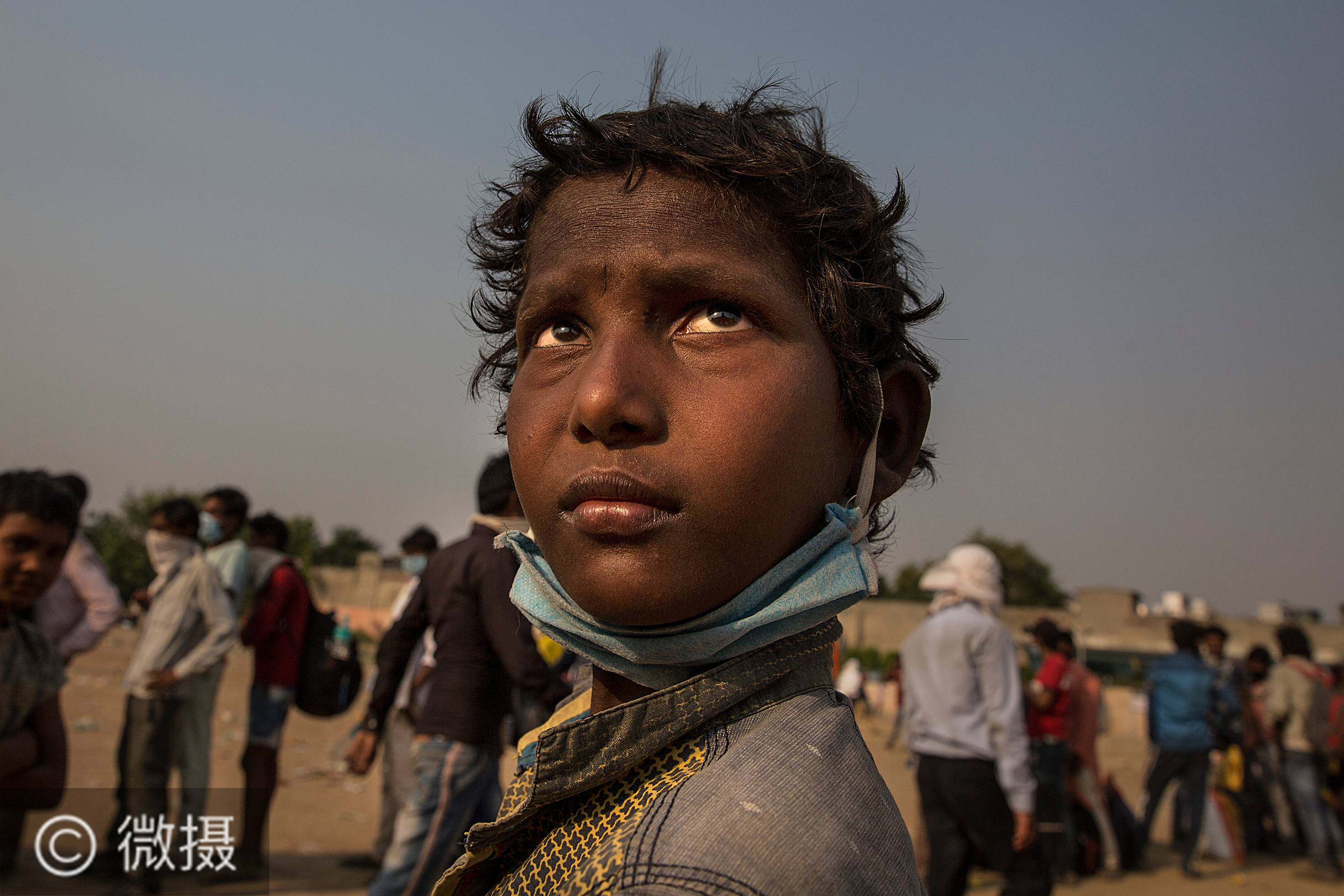 5月18日,在印度新德里郊区的加济阿巴德,一名儿童排队等待登上返乡大巴。为控制新冠疫情,印度自3月25日开始实施全国封锁,导致大批农民工失去工作,陆续踏上返乡路。新华社发(贾韦德·达尔摄)