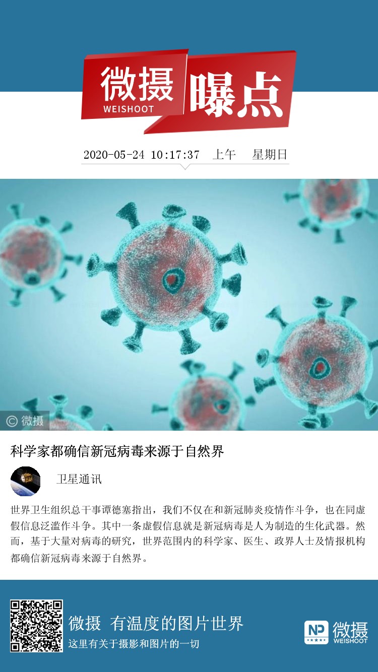 世界卫生组织总干事谭德塞指出,我们不仅在和新冠肺炎疫情作斗争,也在同虚假信息泛滥作斗争。其中一条虚假信息就是新冠病毒是人为制造的生化武器。然而,基于大量对病毒的研究,世界范围内的科学家、医生、政界人士及情报机构都确信新冠病毒来源于自然界。