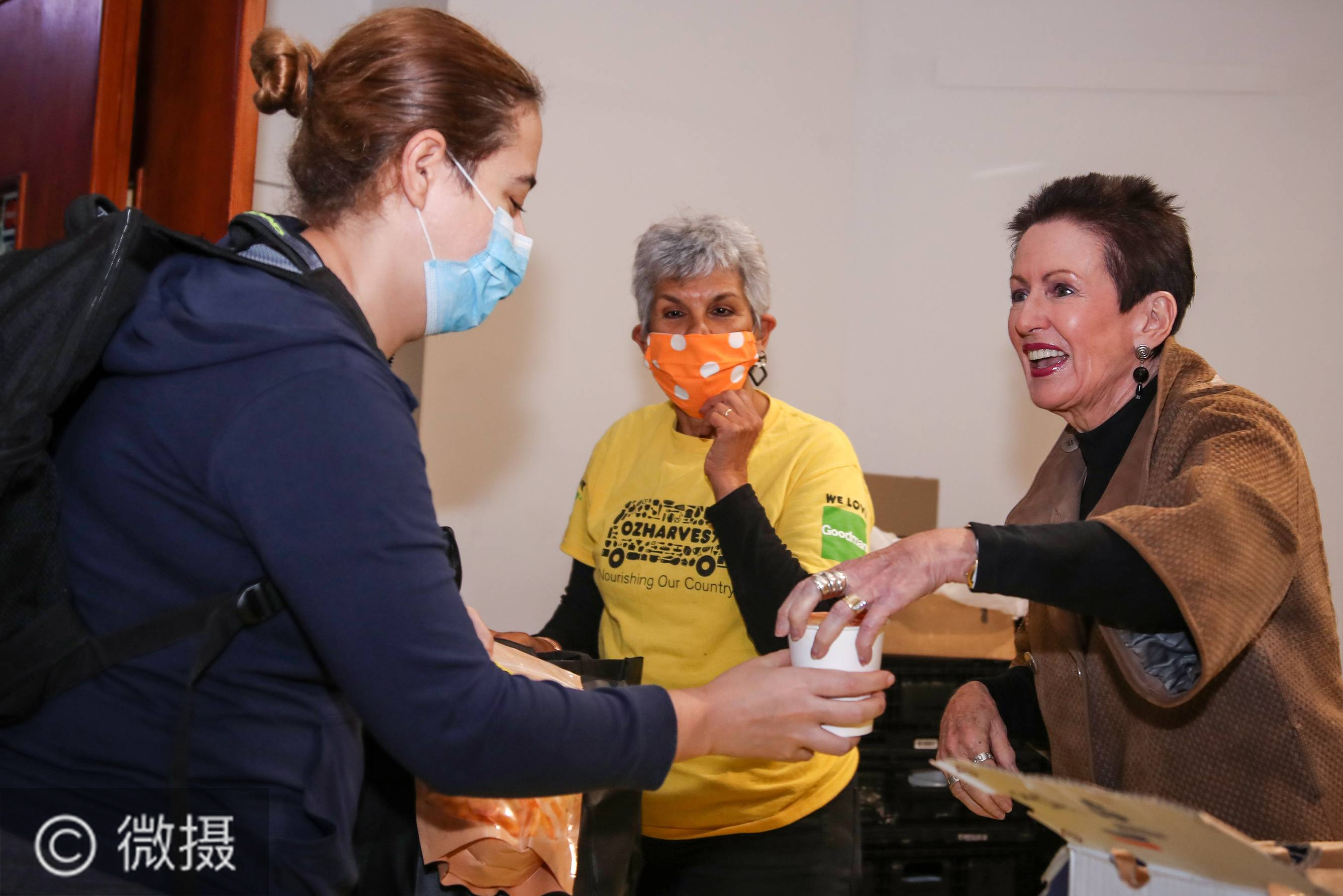 悉尼市政府派发救济食品。5月21日,在澳大利亚悉尼环形码头,悉尼市市长克洛弗·穆尔(右)向留学生发放救济食品。当日,悉尼市政府向受疫情影响的海外留学生和临时签证持有者发放救济食品。新华社记者 白雪飞 摄