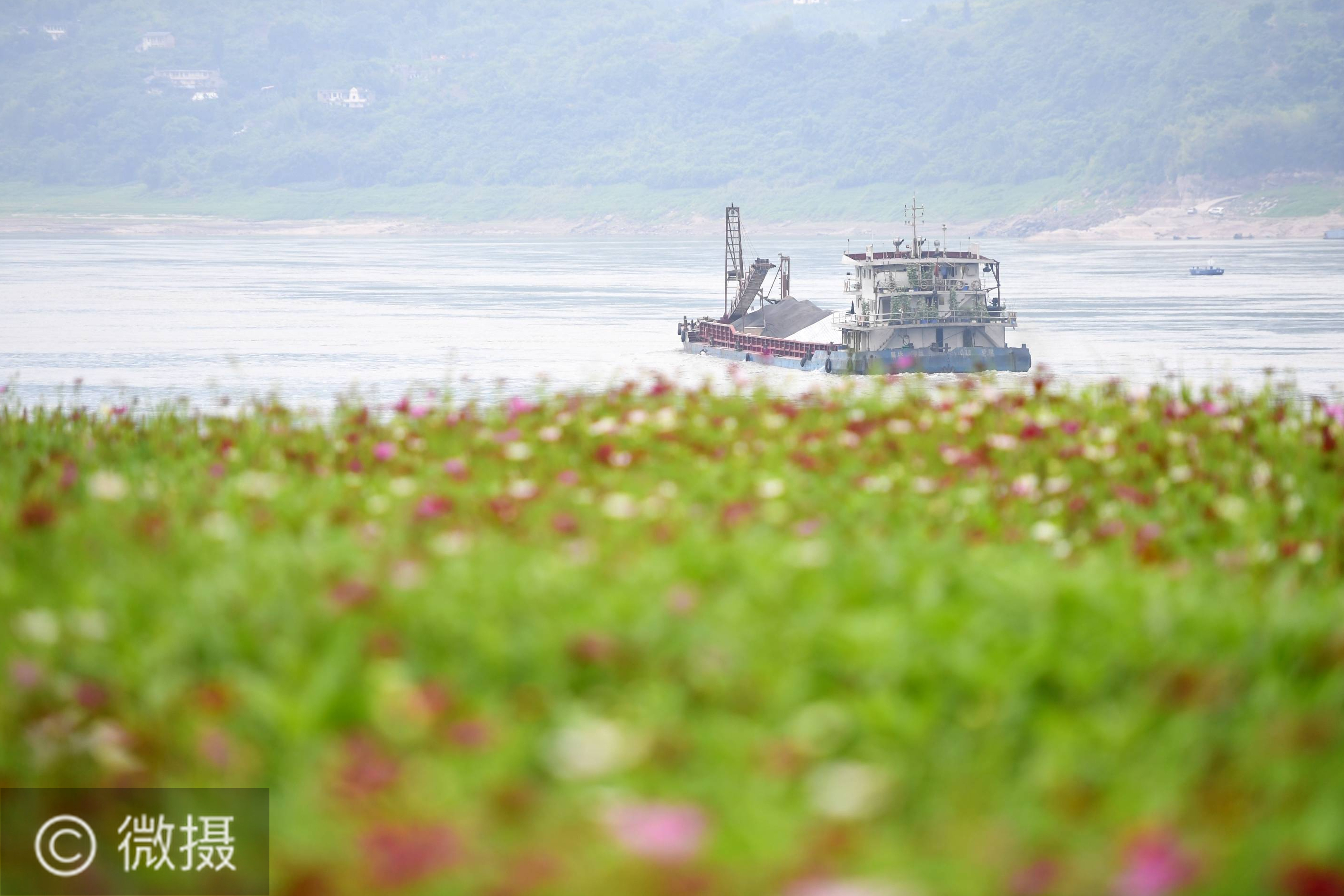 重庆:格桑花开长江畔。5月20日,在重庆市巴南区木洞镇开满格桑花的长江岸边,远处航道上一艘轮船缓缓驶过。近日,重庆市巴南区木洞镇长江岸边的格桑花竞相开放,吸引游客前来赏花观景。新华社记者 唐奕 摄