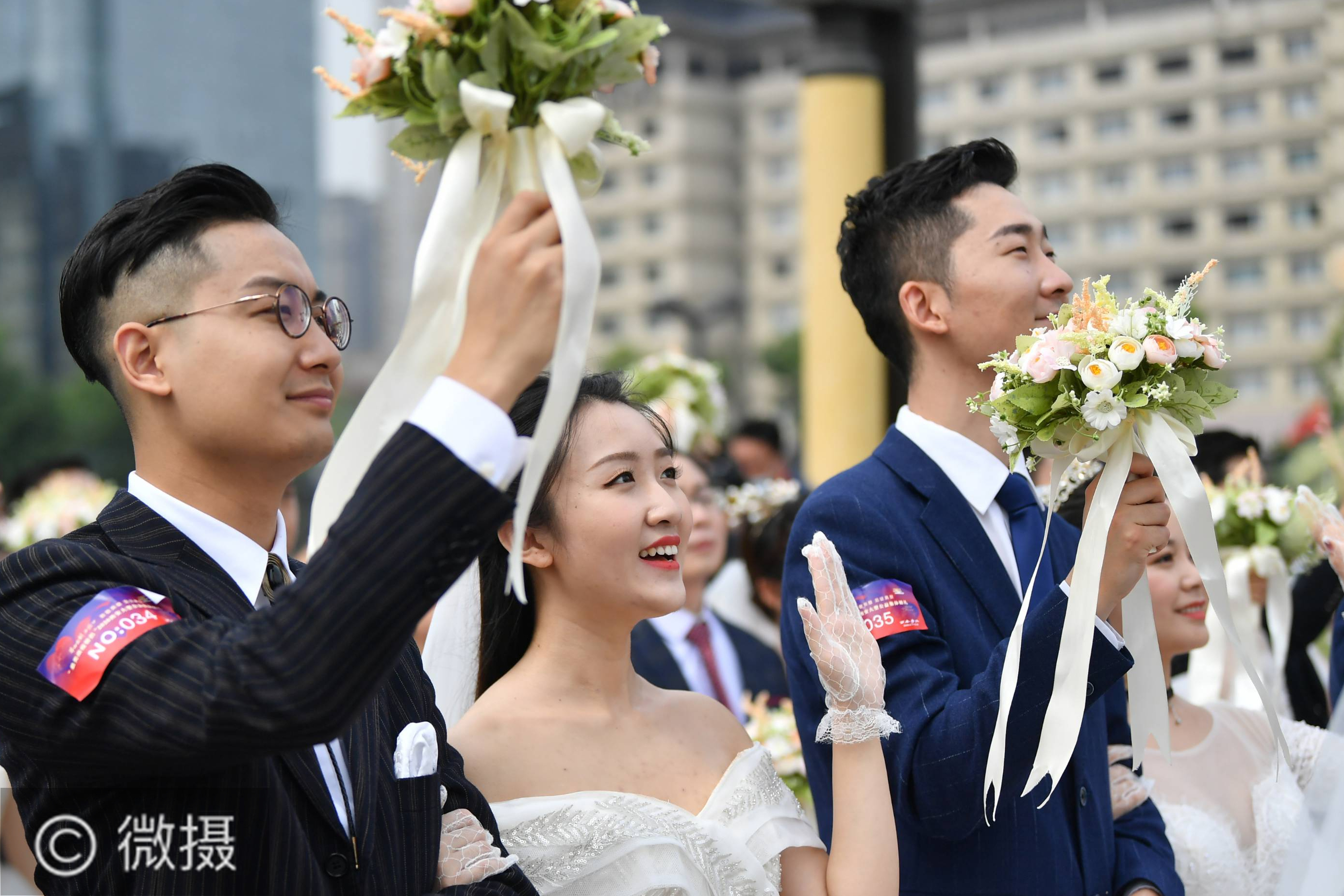 5月20日,新人们在西安永宁门参加集体婚礼。当日,一场为50对战“疫”情侣举行的集体婚礼在西安市永宁门文化庆典广场举行。新人们来自陕西省内的医疗、政府、公安、社区等各个行业,为抗击新冠肺炎疫情,他们延迟了婚期,奋战在各自的岗位上。新华社记者 刘潇 摄