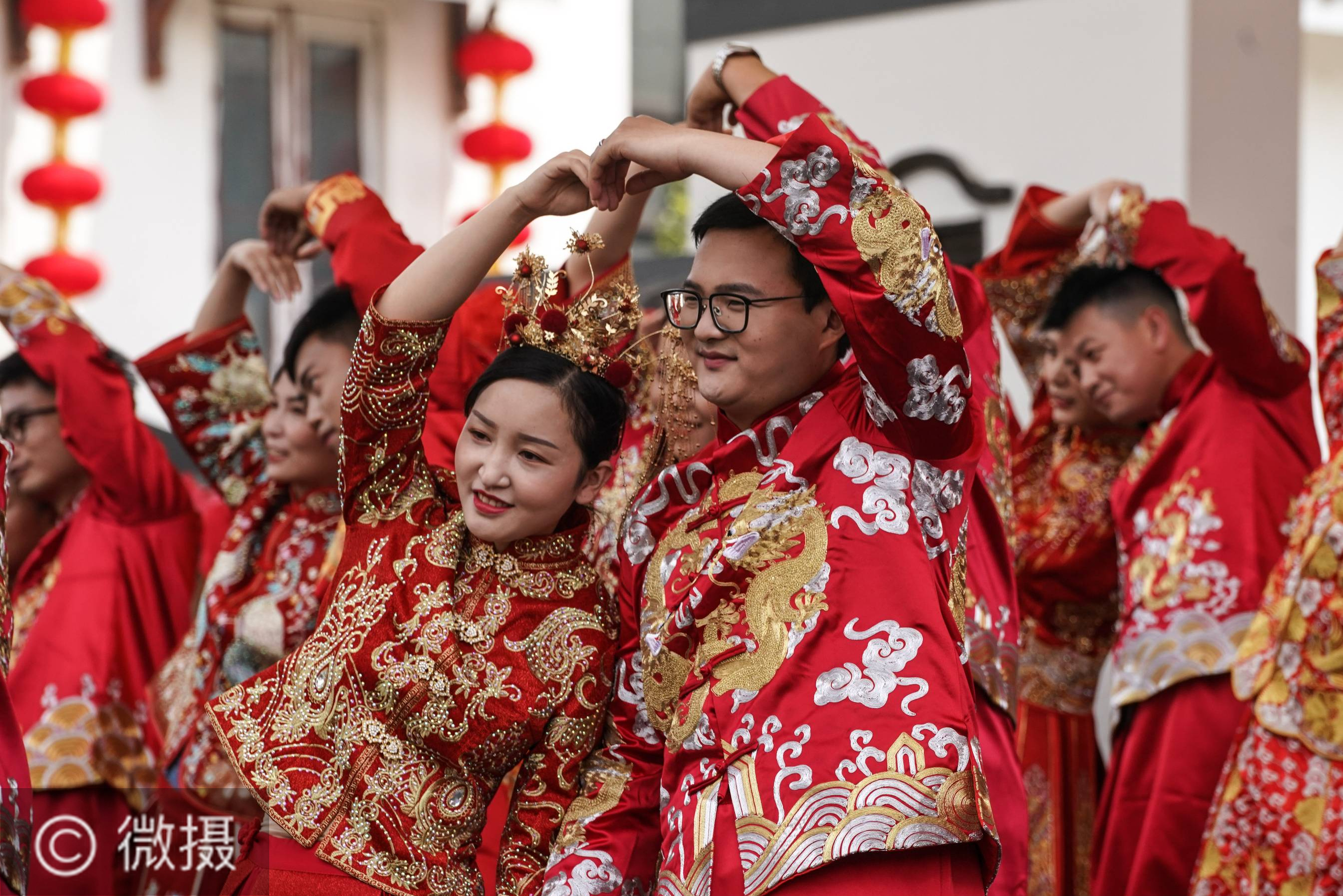 周庄举办水乡集体婚礼。 5月20日,新人们在集体婚礼仪式上比心。当日,52对新人在江苏省昆山市周庄镇集体举办传统的水乡婚礼。5月19日是中国旅游日,江苏省昆山市周庄镇举办以“国风夜周庄”为主题的古镇沉浸式旅游体验活动。新华社记者 杨磊 摄