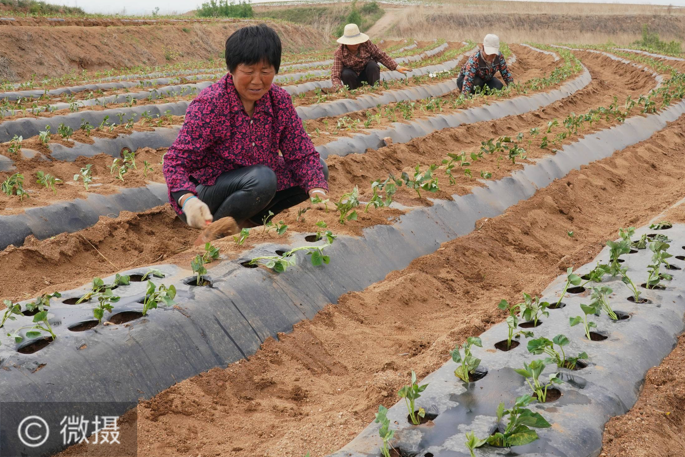 5月20日,卢龙县潘庄镇大岭村村民在田间给刚栽植的红薯苗培土。小满时节,正值河北省卢龙县旱作梯田大面积播种、春苗加强管护时节,广大农民抢抓农时,田间一派繁忙景象。新华社记者 杨世尧 摄