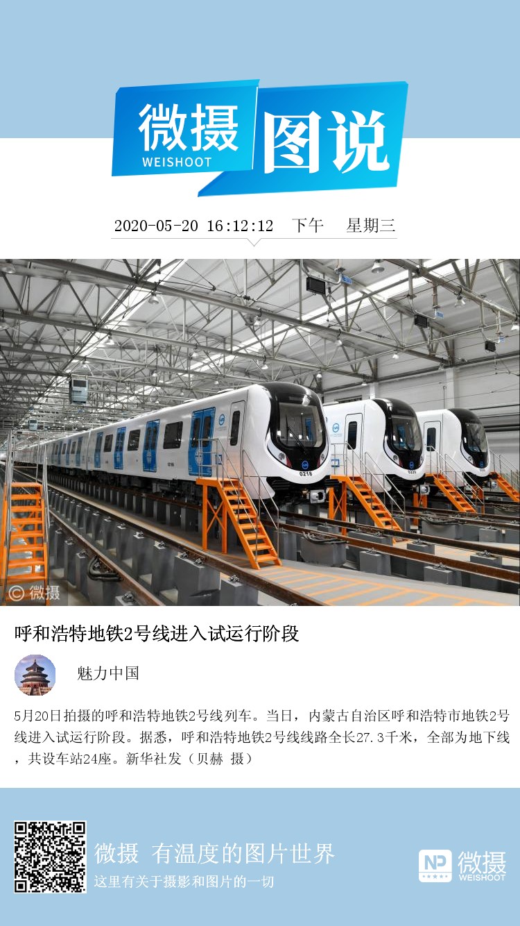 5月20日拍摄的呼和浩特地铁2号线列车。当日,内蒙古自治区呼和浩特市地铁2号线进入试运行阶段。据悉,呼和浩特地铁2号线线路全长27.3千米,全部为地下线,共设车站24座。新华社发(贝赫 摄)
