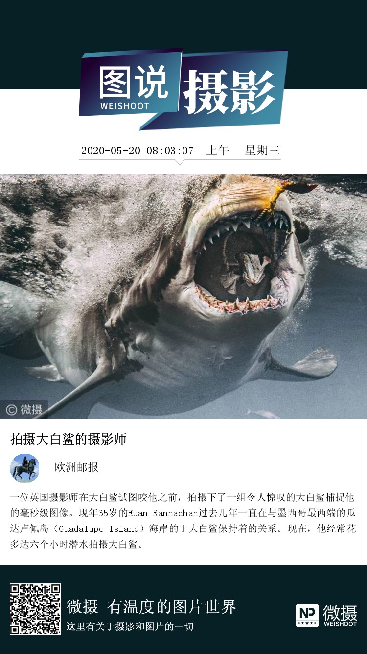 一位英国摄影师在大白鲨试图咬他之前,拍摄下了一组令人惊叹的大白鲨捕捉他的毫秒级图像。现年35岁的Euan Rannachan过去几年一直在与墨西哥最西端的瓜达卢佩岛(Guadalupe Island)海岸的于大白鲨保持着的关系。现在,他经常花多达六个小时潜水拍摄大白鲨。