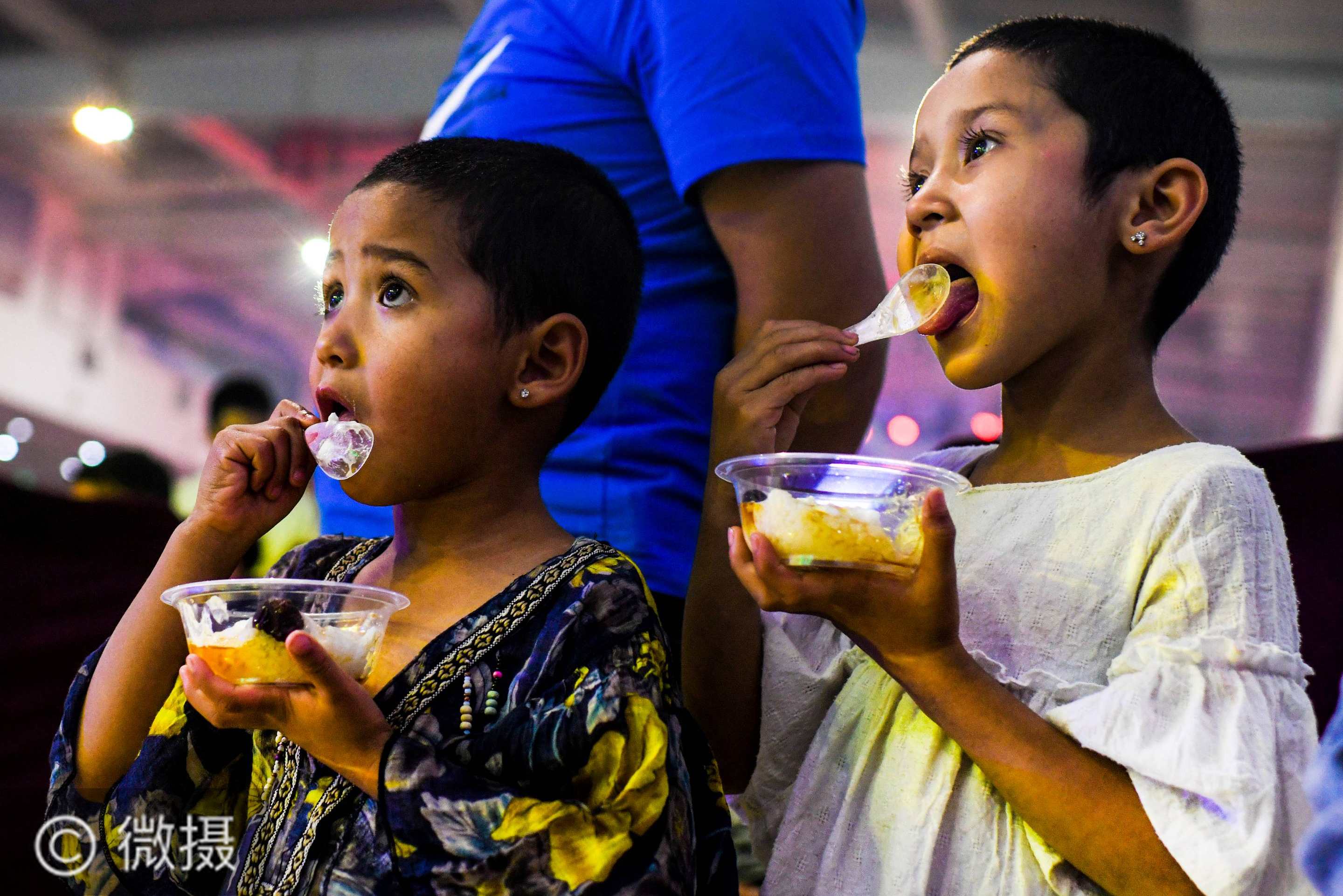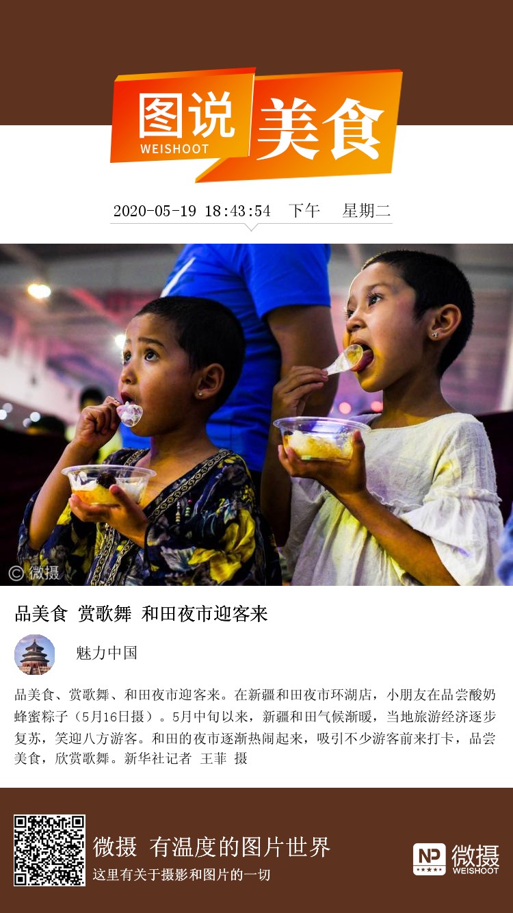 品美食、赏歌舞、和田夜市迎客来。在新疆和田夜市环湖店,小朋友在品尝酸奶蜂蜜粽子(5月16日摄)。5月中旬以来,新疆和田气候渐暖,当地旅游经济逐步复苏,笑迎八方游客。和田的夜市逐渐热闹起来,吸引不少游客前来打卡,品尝美食,欣赏歌舞。新华社记者 王菲 摄