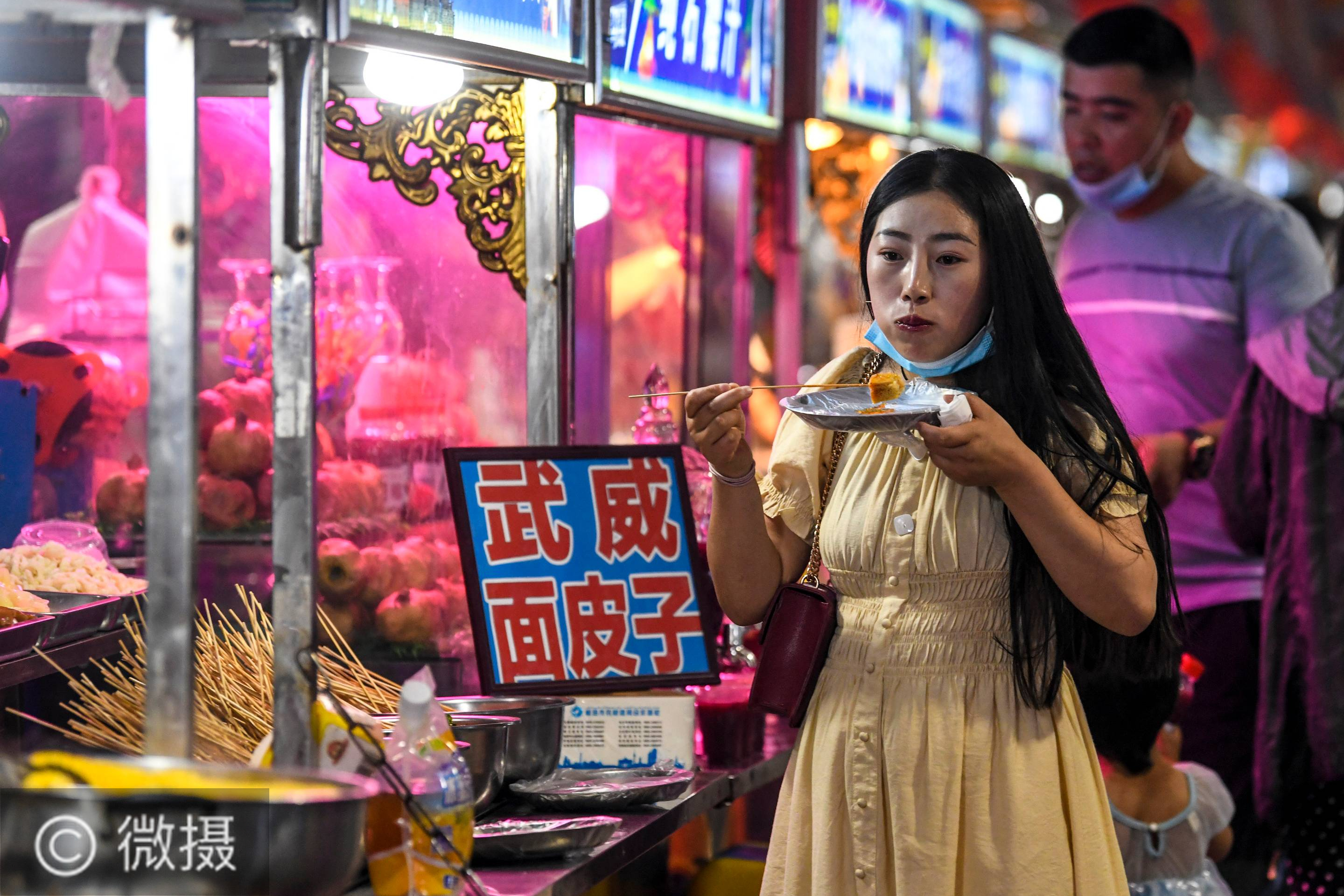 品美食、赏歌舞、和田夜市迎客来。在新疆和田夜市,一名游客在品尝美食(5月18日摄)。5月中旬以来,新疆和田气候渐暖,当地旅游经济逐步复苏,笑迎八方游客。和田的夜市逐渐热闹起来,吸引不少游客前来打卡,品尝美食,欣赏歌舞。新华社记者 王菲 摄