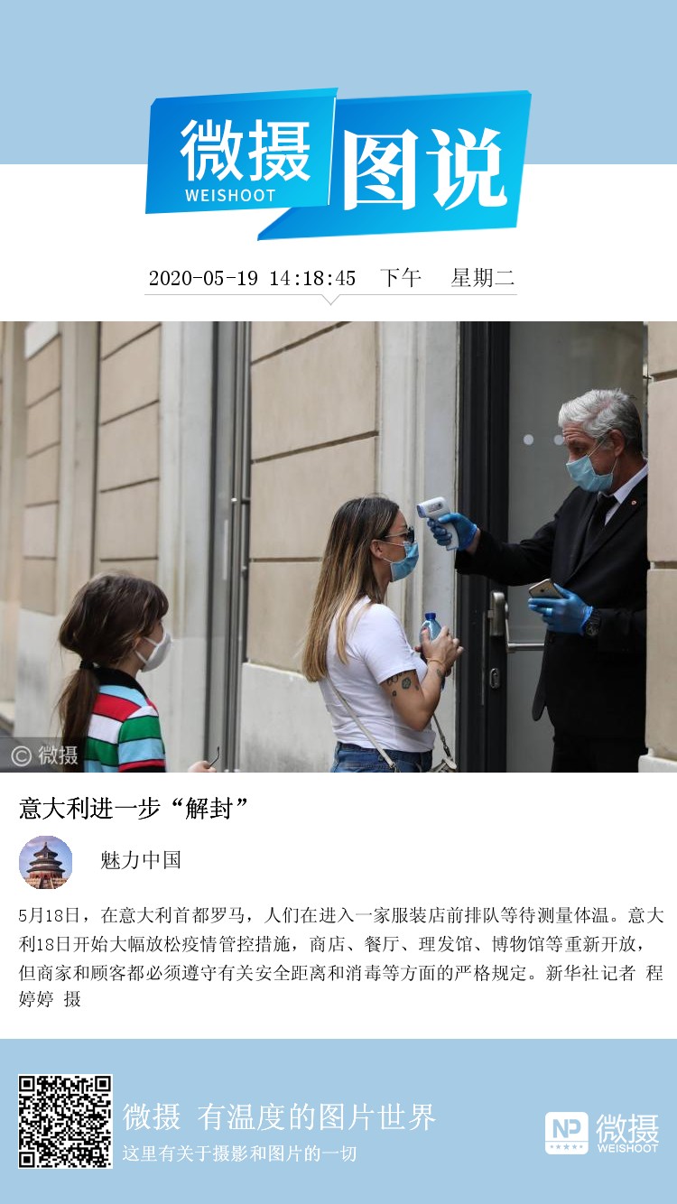 5月18日,在意大利首都罗马,人们在进入一家服装店前排队等待测量体温。意大利18日开始大幅放松疫情管控措施,商店、餐厅、理发馆、博物馆等重新开放,但商家和顾客都必须遵守有关安全距离和消毒等方面的严格规定。新华社记者 程婷婷 摄