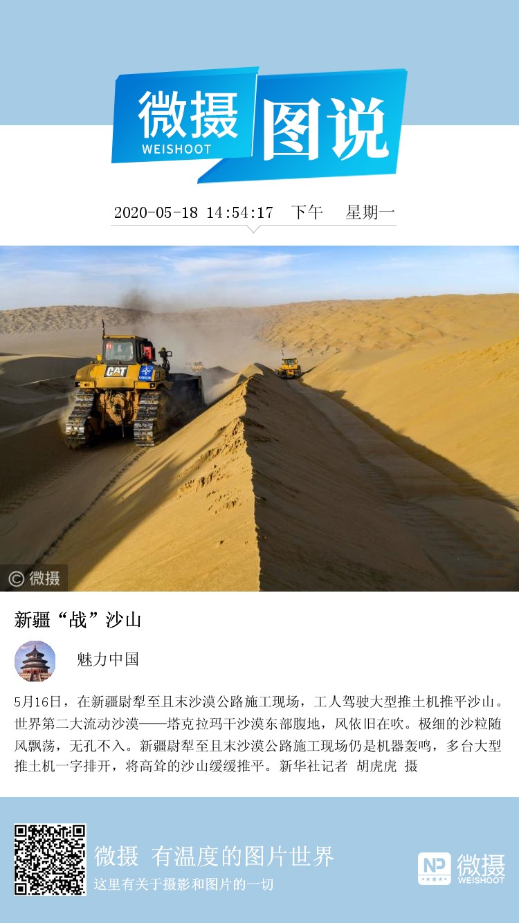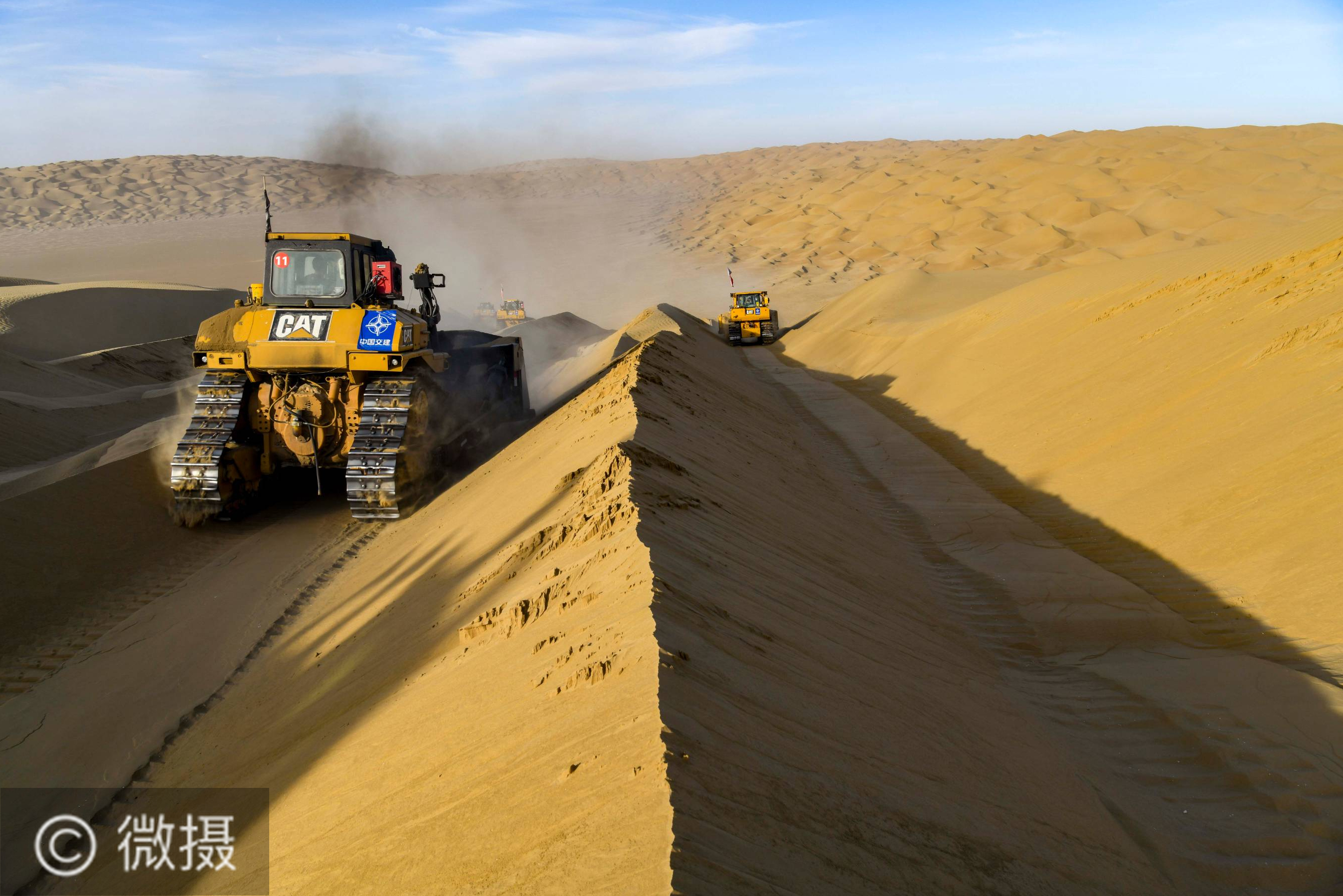 5月16日,在新疆尉犁至且末沙漠公路施工现场,工人驾驶大型推土机推平沙山。世界第二大流动沙漠——塔克拉玛干沙漠东部腹地,风依旧在吹。极细的沙粒随风飘荡,无孔不入。新疆尉犁至且末沙漠公路施工现场仍是机器轰鸣,多台大型推土机一字排开,将高耸的沙山缓缓推平。新华社记者 胡虎虎 摄