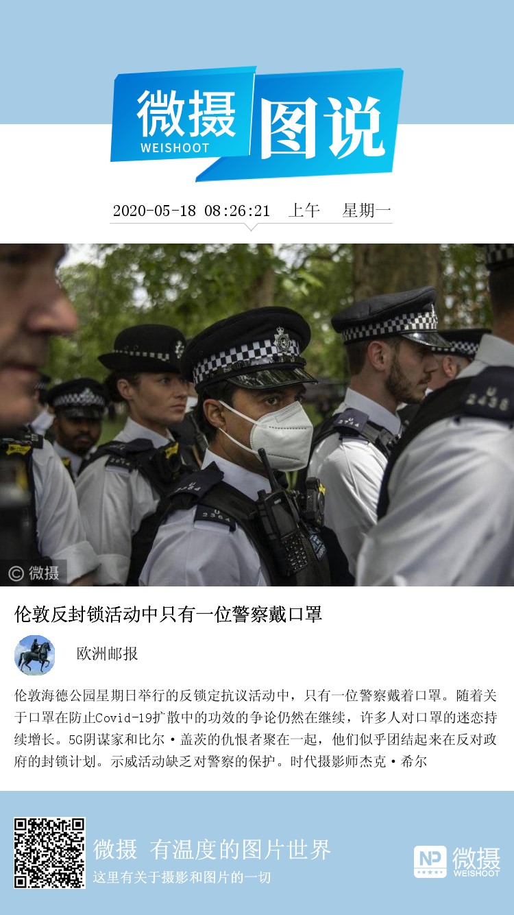 伦敦海德公园星期日举行的反锁定抗议活动中,只有一位警察戴着口罩。随着关于口罩在防止Covid-19扩散中的功效的争论仍然在继续,许多人对口罩的迷恋持续增长。5G阴谋家和比尔·盖茨的仇恨者聚在一起,他们似乎团结起来在反对政府的封锁计划。示威活动缺乏对警察的保护。时代摄影师杰克·希尔