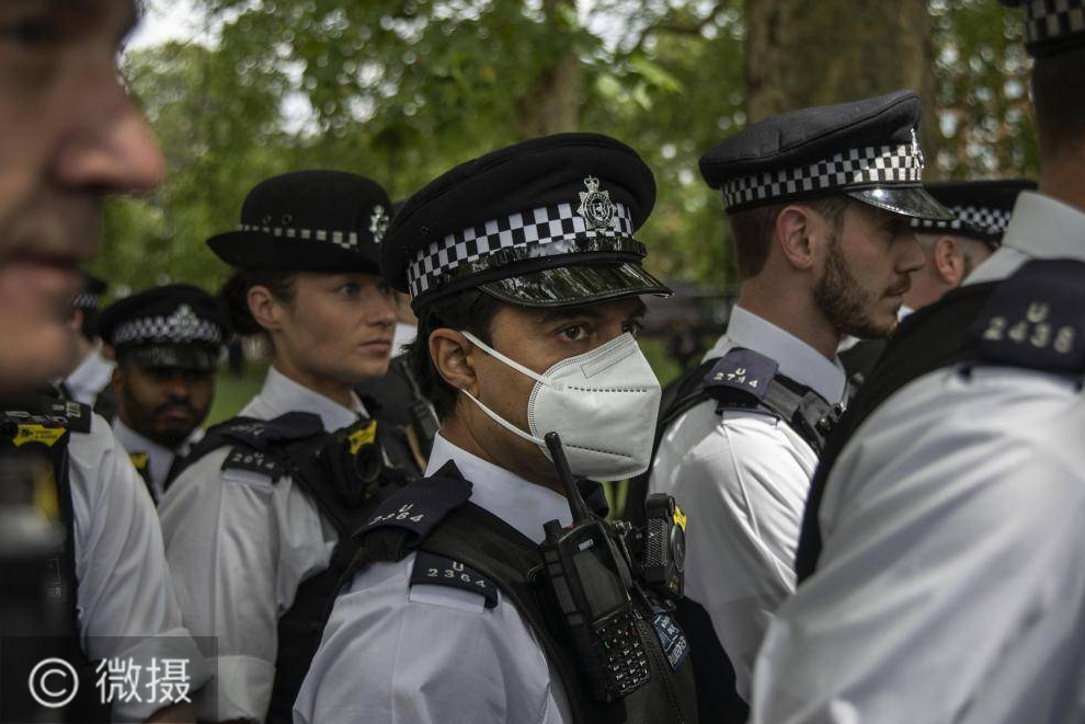 伦敦反封锁活动中只有一位警察戴口罩