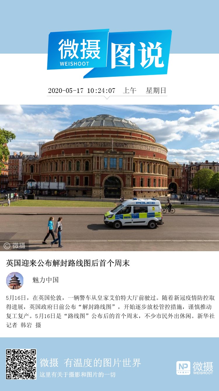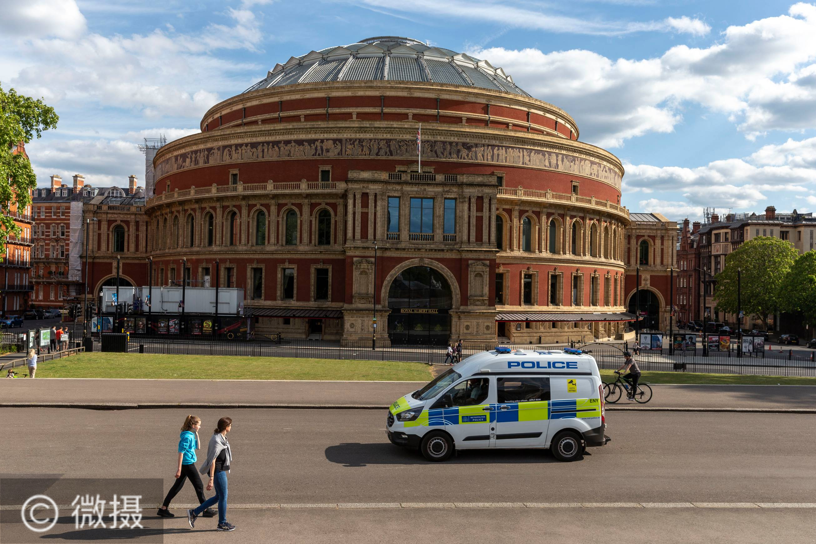 5月16日,在英国伦敦,一辆警车从皇家艾伯特大厅前驶过。随着新冠疫情防控取得进展,英国政府日前公布“解封路线图”,开始逐步放松管控措施,谨慎推动复工复产。5月16日是“路线图”公布后的首个周末,不少市民外出休闲。新华社记者 韩岩 摄