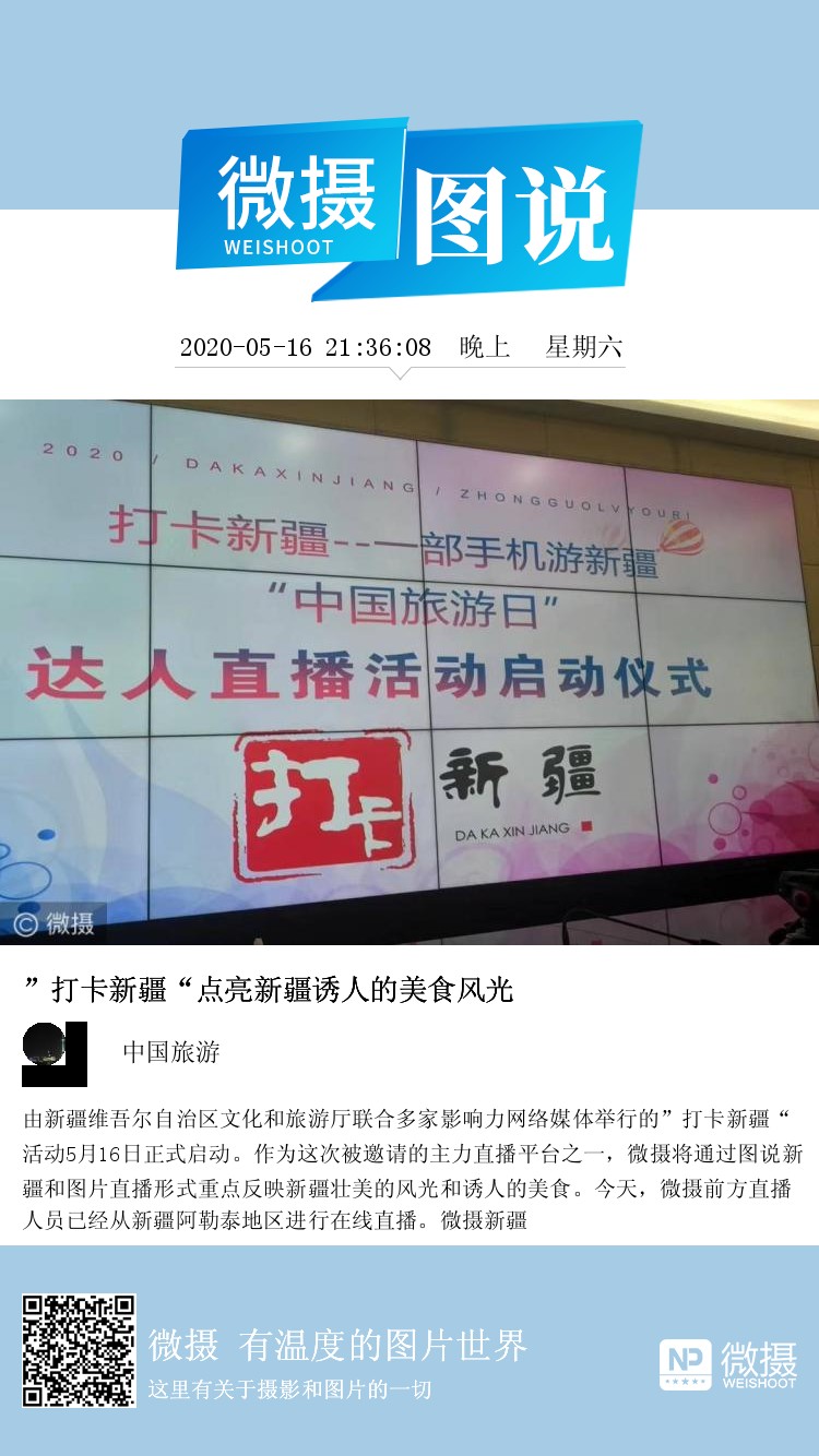 由新疆维吾尔自治区文化和旅游厅联合多家影响力网络媒体举行的”打卡新疆“活动5月16日正式启动。作为这次被邀请的主力直播平台之一,微摄将通过图说新疆和图片直播形式重点反映新疆壮美的风光和诱人的美食。今天,微摄前方直播人员已经从新疆阿勒泰地区进行在线直播。微摄新疆