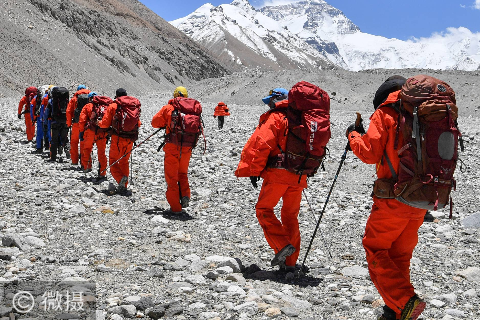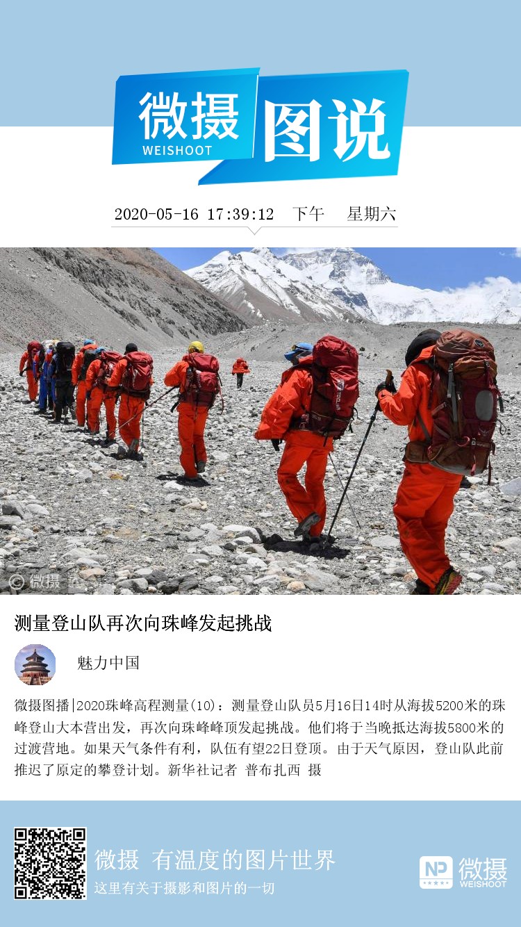 微摄图播|2020珠峰高程测量(10):测量登山队员5月16日14时从海拔5200米的珠峰登山大本营出发,再次向珠峰峰顶发起挑战。他们将于当晚抵达海拔5800米的过渡营地。如果天气条件有利,队伍有望22日登顶。由于天气原因,登山队此前推迟了原定的攀登计划。新华社记者 普布扎西 摄