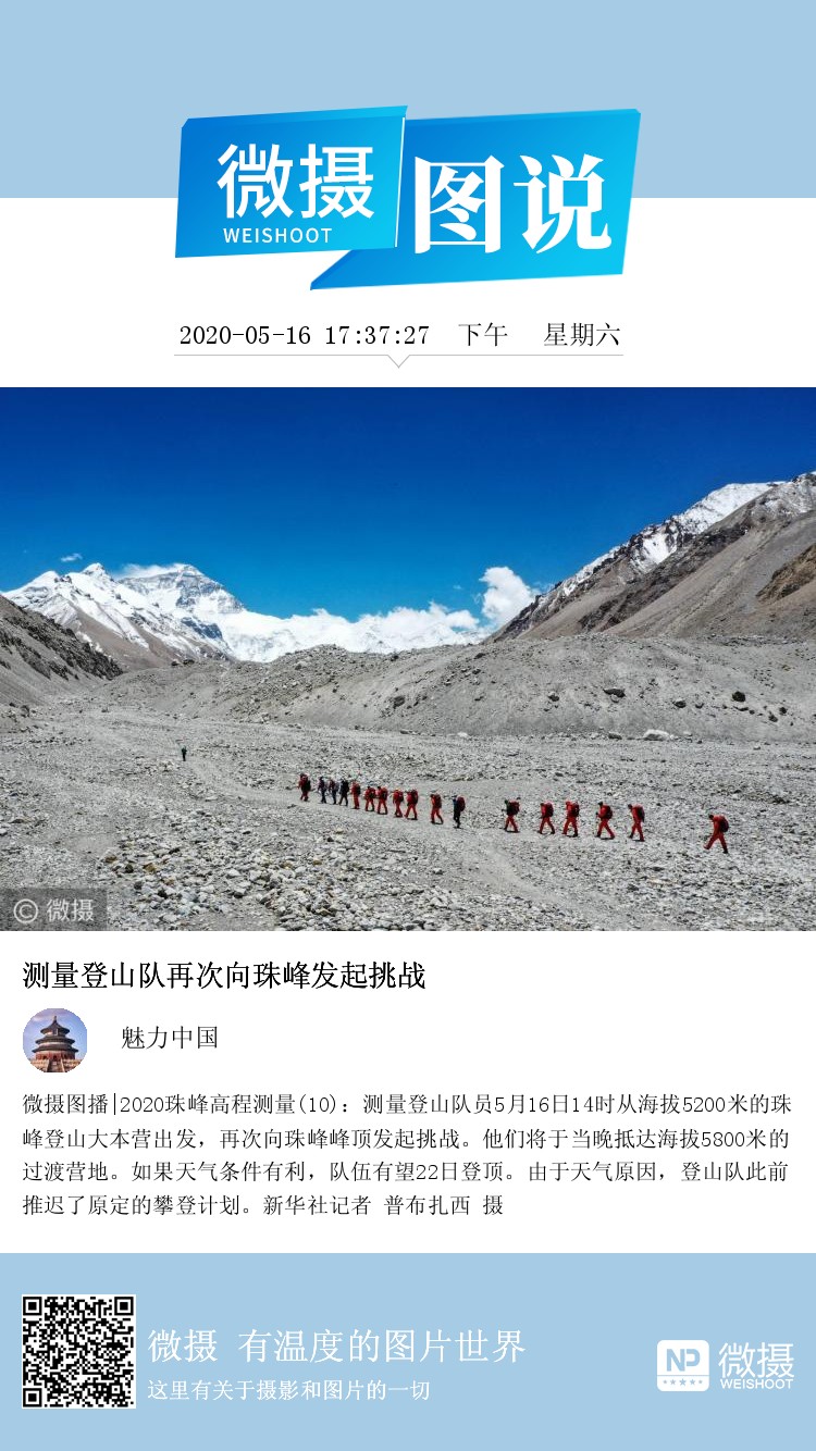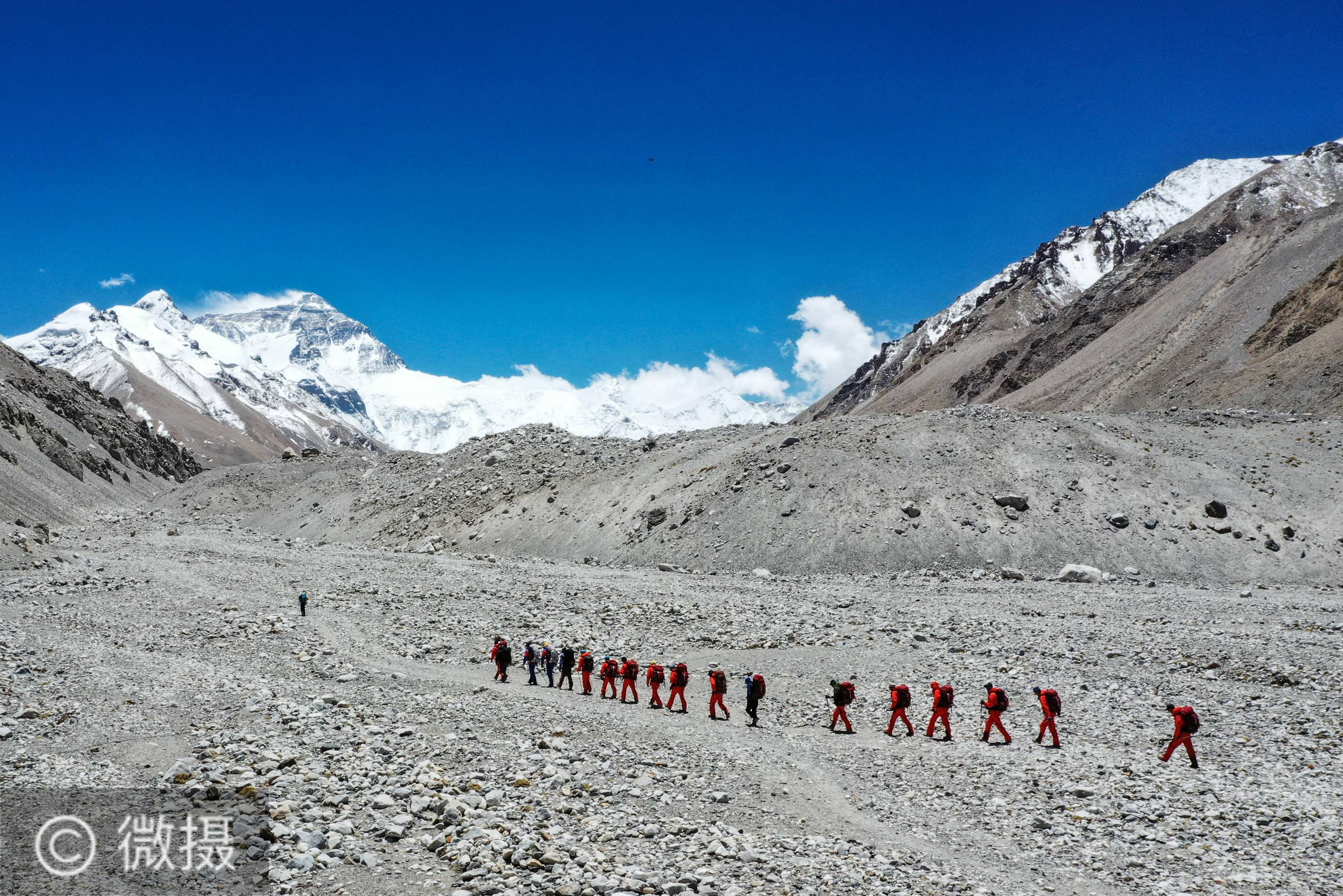 微摄图播|2020珠峰高程测量(10):测量登山队员5月16日14时从海拔5200米的珠峰登山大本营出发,再次向珠峰峰顶发起挑战。他们将于当晚抵达海拔5800米的过渡营地。如果天气条件有利,队伍有望22日登顶。由于天气原因,登山队此前推迟了原定的攀登计划。新华社记者 普布扎西 摄