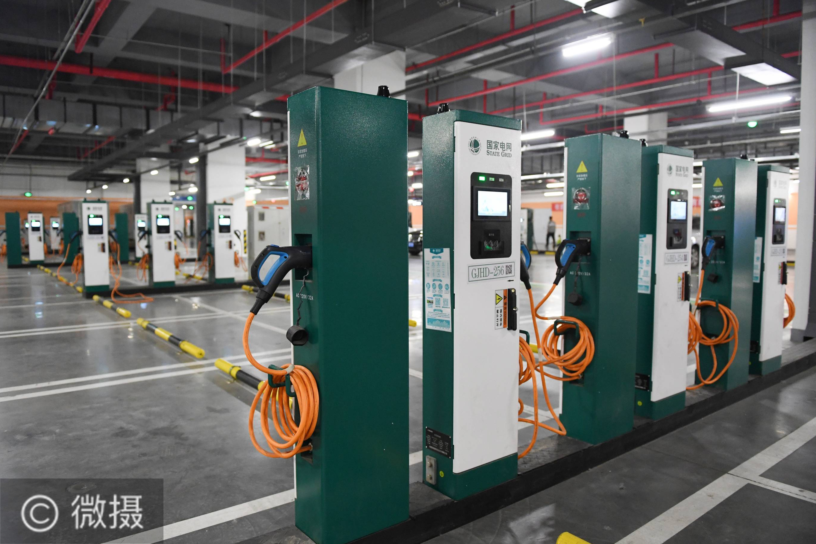 北京规模最大的集中式电动汽车充电站已于5月15日在五棵松体育中心地下停车场投入使用。该充电站共有200个充电桩,包括80个60千瓦直流充电桩和120个7千瓦交流充电桩,单日可最大提供约1300车次充电服务能力。新华社记者 鞠焕宗 摄