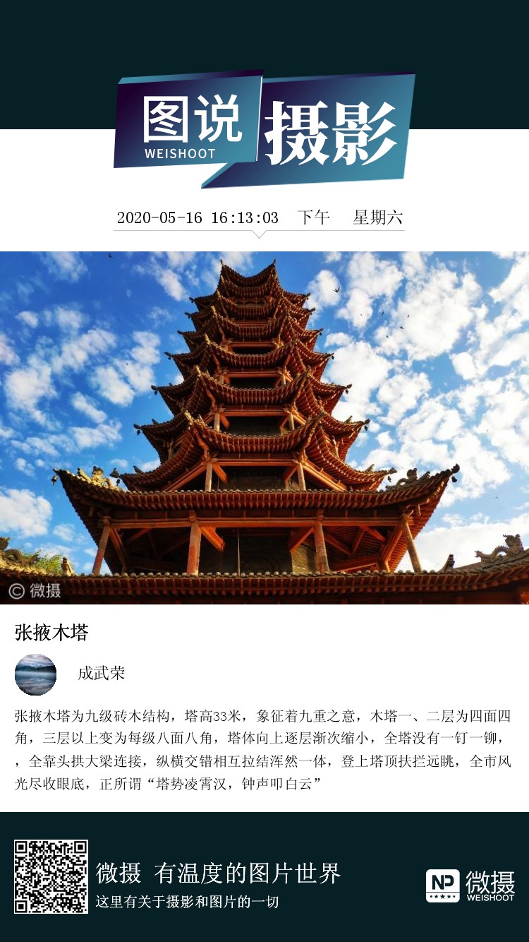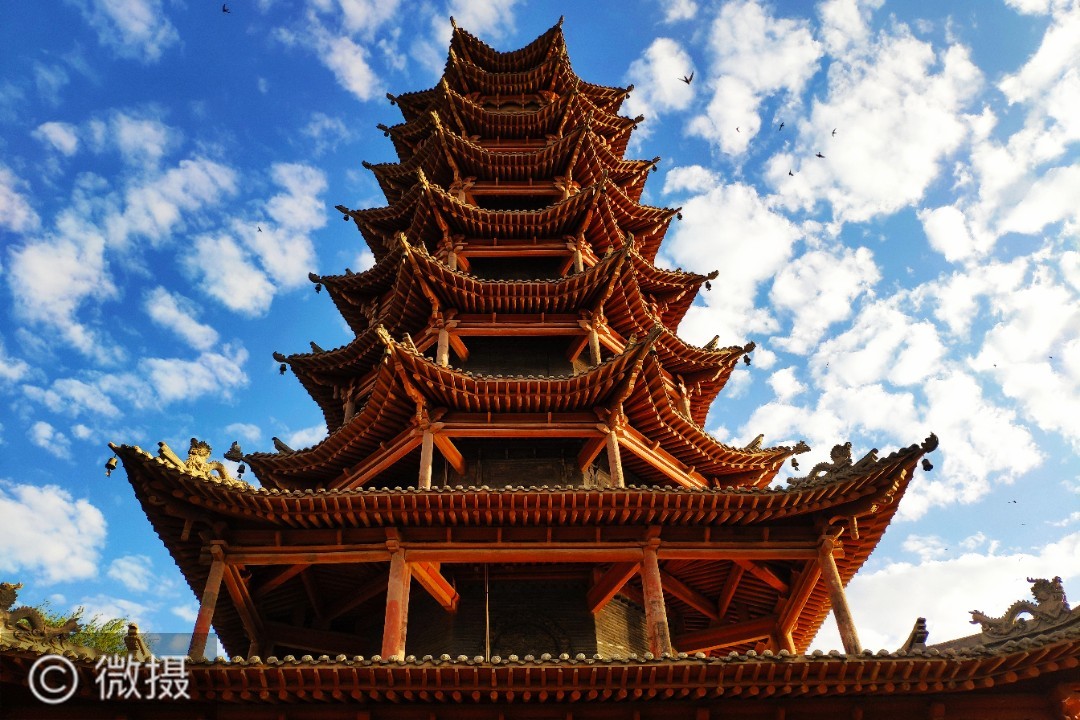张掖木塔为九级砖木结构,塔高33米,象征着九重之意,木塔一、二层为四面四角,三层以上变为每级八面八角,塔体向上逐层渐次缩小,全塔没有一钉一铆,,全靠头拱大梁连接,纵横交错相互拉结浑然一体,登上塔顶扶拦远眺,全市风光尽收眼底,正所谓“塔势凌霄汉,钟声叩白云”