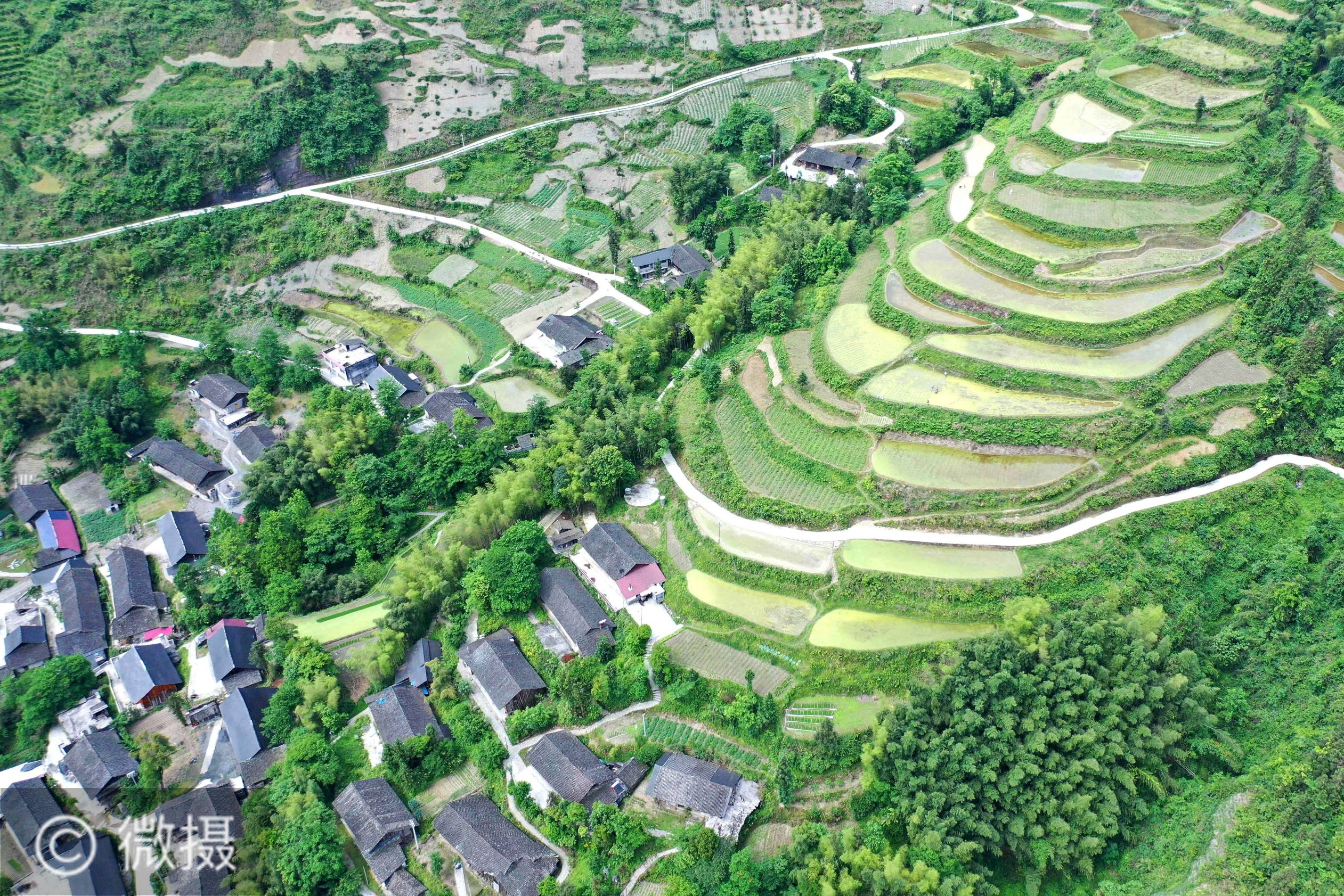 这是5月15日拍摄的湖北省宣恩县高罗镇大茅坡营村蓄水的梯田和民居(无人机照片)。时下,湖北省恩施土家族苗族自治州宣恩县高罗镇大茅坡营村千亩梯田进入插秧季,蓄水的梯田、劳作的农民与传统民居构成了一幅美丽的农耕画卷。新华社发(宋文 摄)