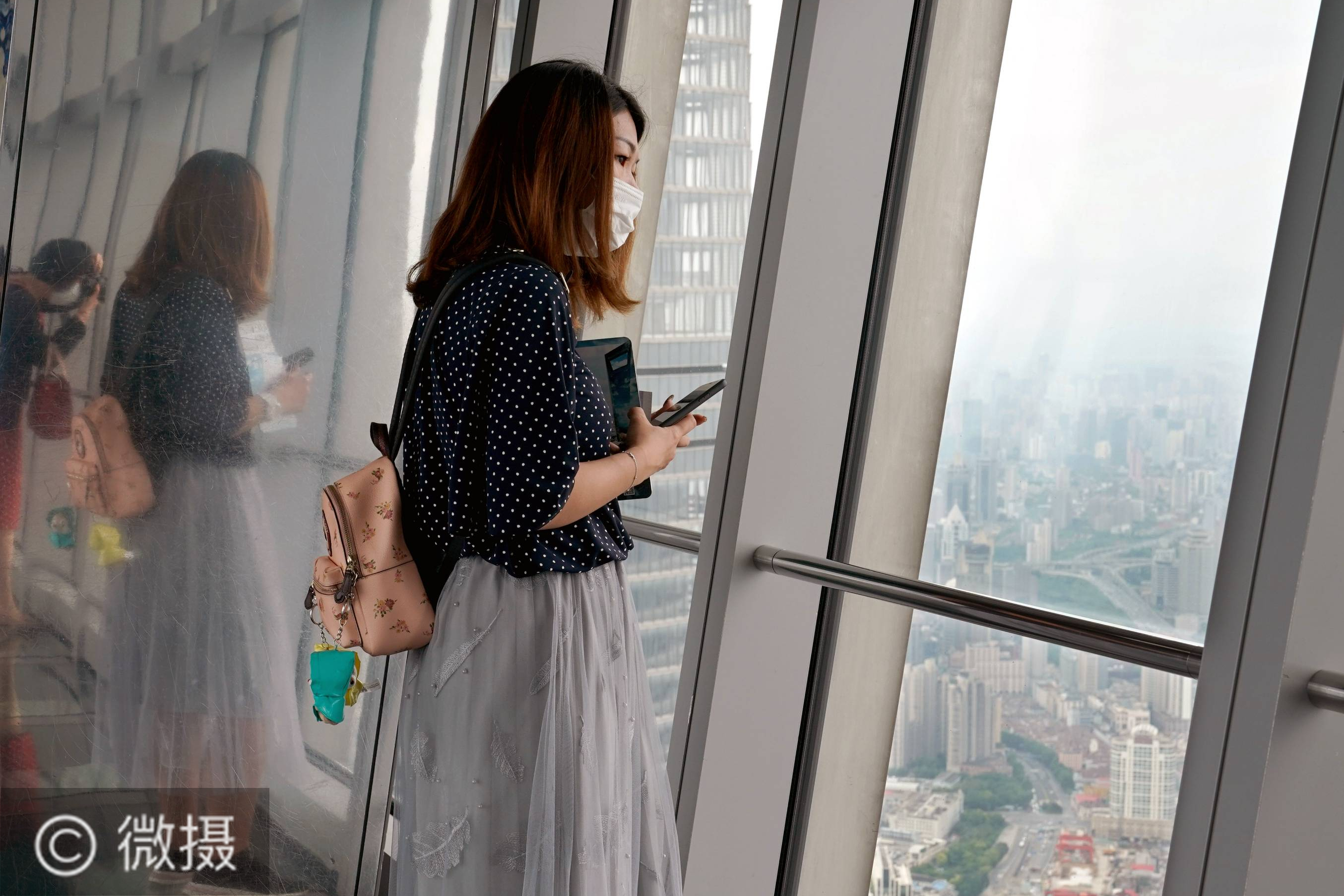 5月15日,游客在恢复开放的上海环球金融中心观光厅欣赏上海景色。当日,因疫情关闭的上海环球金融中心观光厅恢复营业。恢复开放期间,上海环球金融中心观光厅调整了电梯载客人数和游客通道,采用新的实名制购票系统,并采取体温测量、人数限流、定时消毒等防疫举措。新华社记者 刘颖 摄