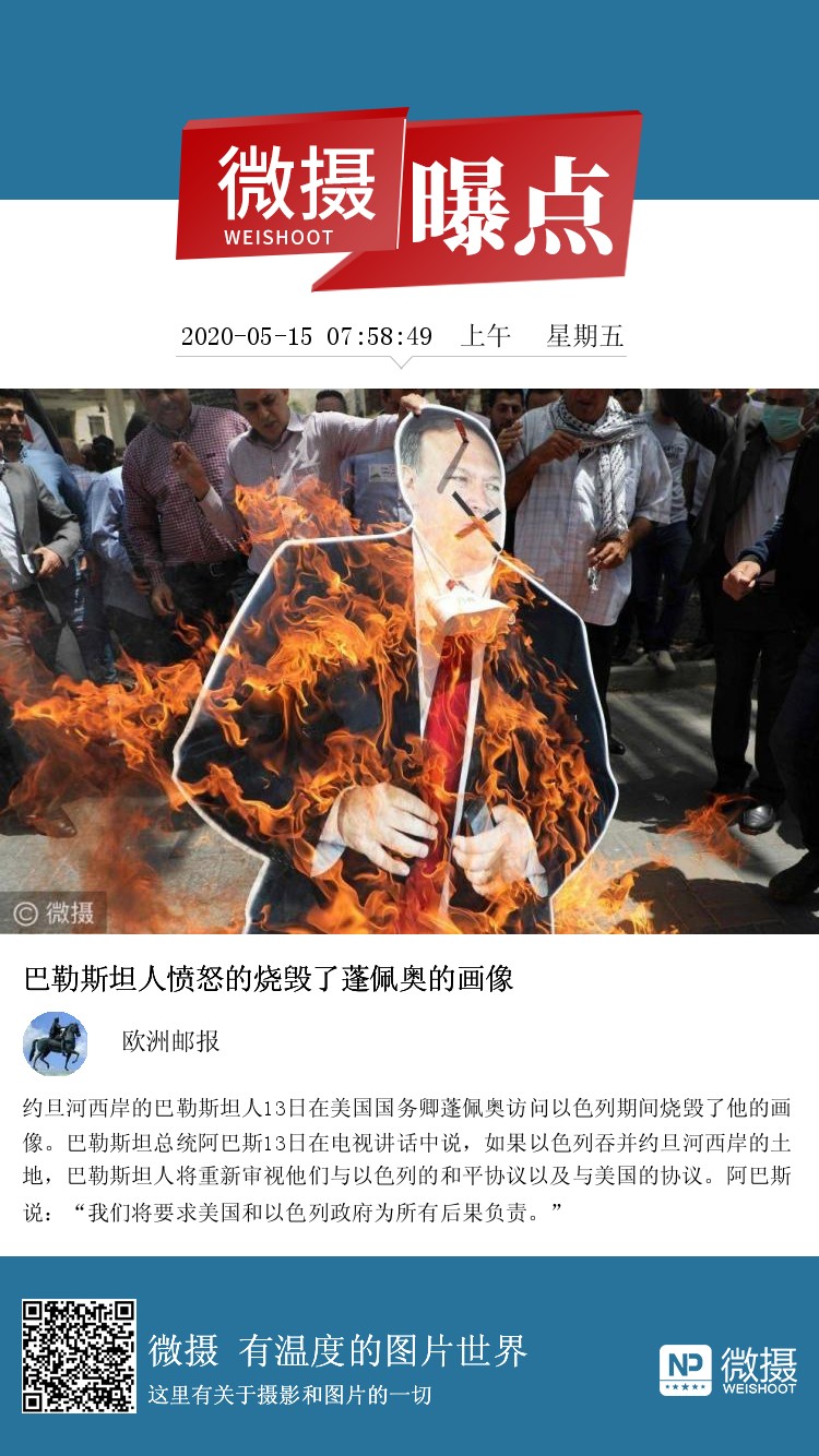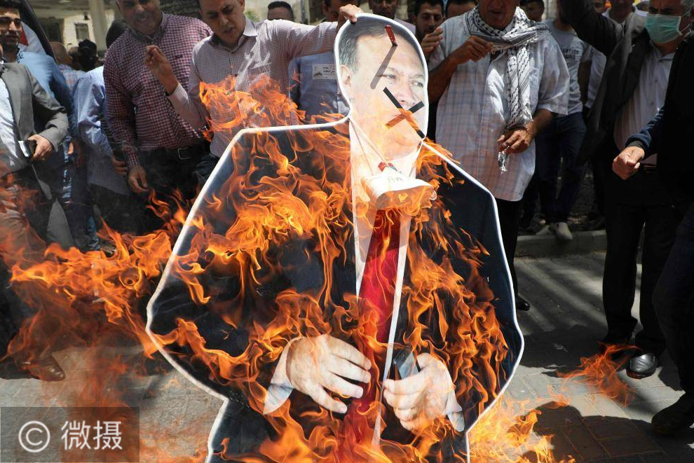 巴勒斯坦人愤怒的烧毁了蓬佩奥的画像