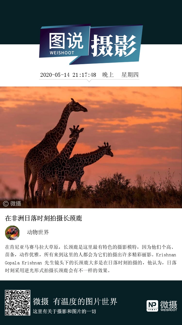 在肯尼亚马赛马拉大草原,长颈鹿是这里最有特色的摄影模特,因为他们个高、苗条,动作优雅,所有来到这里的人都会为它们拍摄出许多精彩丽影。Krishnan Gopala Krishnan 先生镜头下的长颈鹿大多是在日落时刻拍摄的,他认为,日落时刻采用逆光形式拍摄长颈鹿会有不一样的效果。
