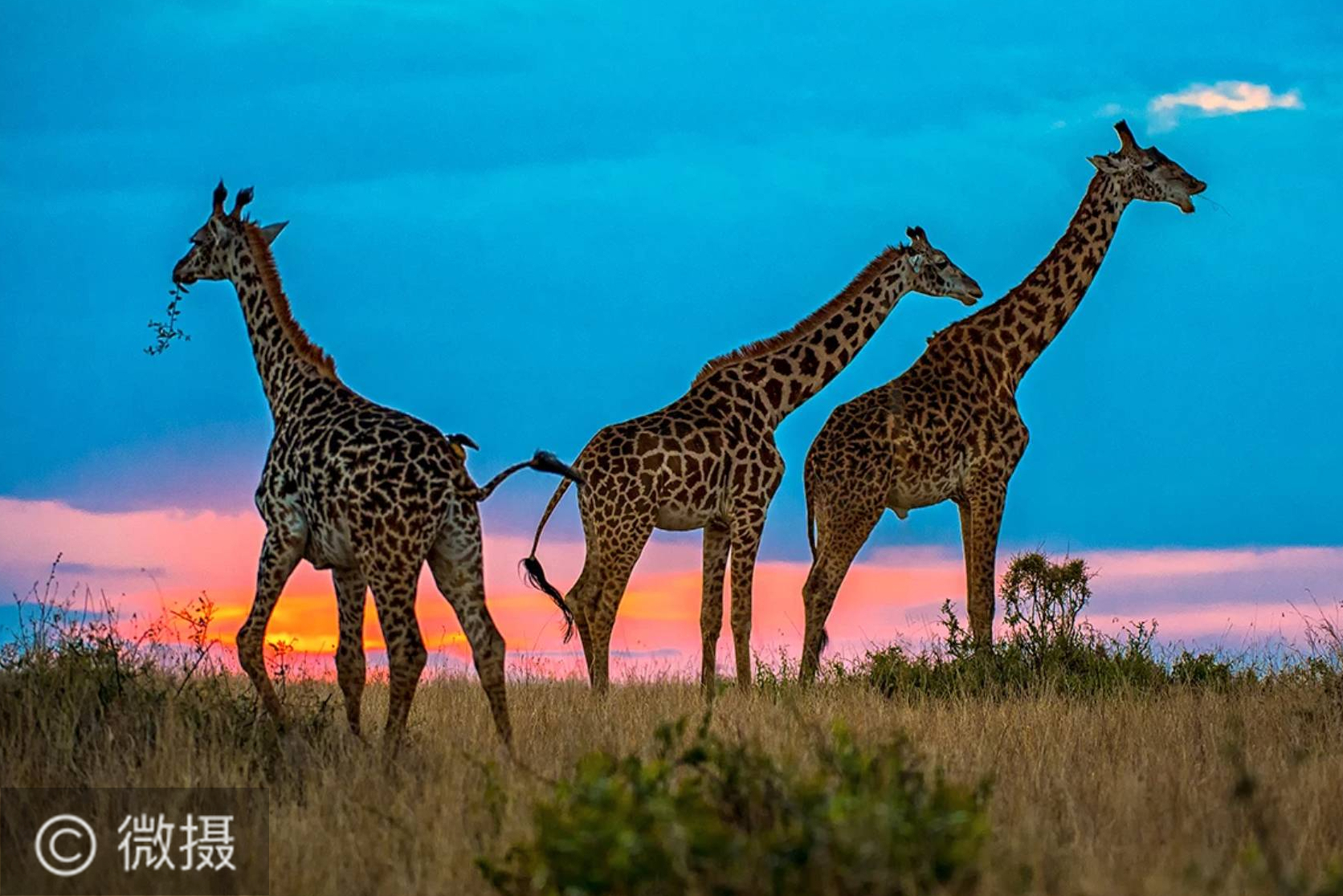 在肯尼亚马赛马拉大草原,长颈鹿是这里最有特色的摄影模特,因为他们个高、苗条,动作优雅,所有来到这里的人都会为它们拍摄出许多精彩丽影。Krishnan Gopala Krishnan 先生镜头下的长颈鹿大多是在日落时刻拍摄的,他认为,日落时刻采用逆光形式拍摄长颈鹿会有不一样的效果。