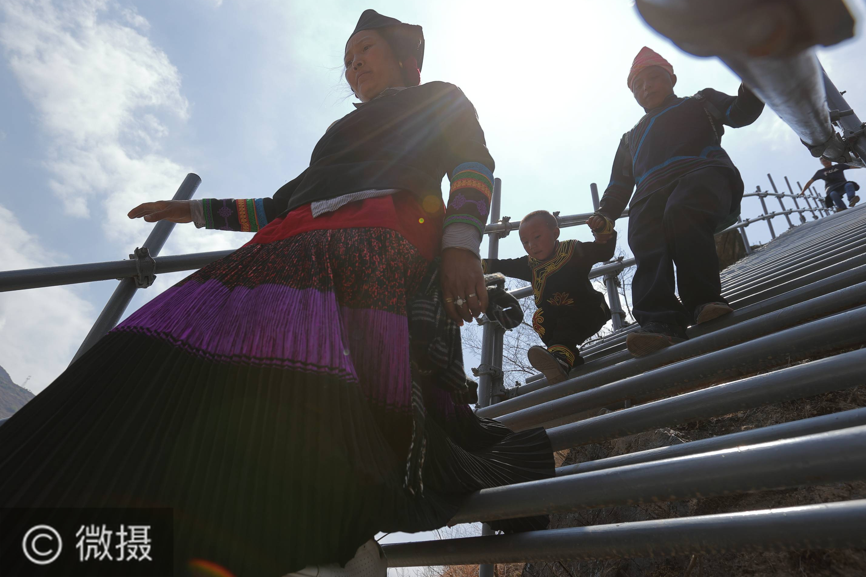 5月13日,四川省昭觉县支尔莫乡“悬崖村”——阿土列尔村高山区的31户贫困户搬到县城集中安置点。走下钢梯,走上楼梯,他们的居住条件实现历史性改变。 “悬崖村”与地面垂直距离约800米,至今无法实现整村通公路,因村民进出村庄需攀爬陡峭的悬崖而备受关注。新华社记者 江宏景 摄