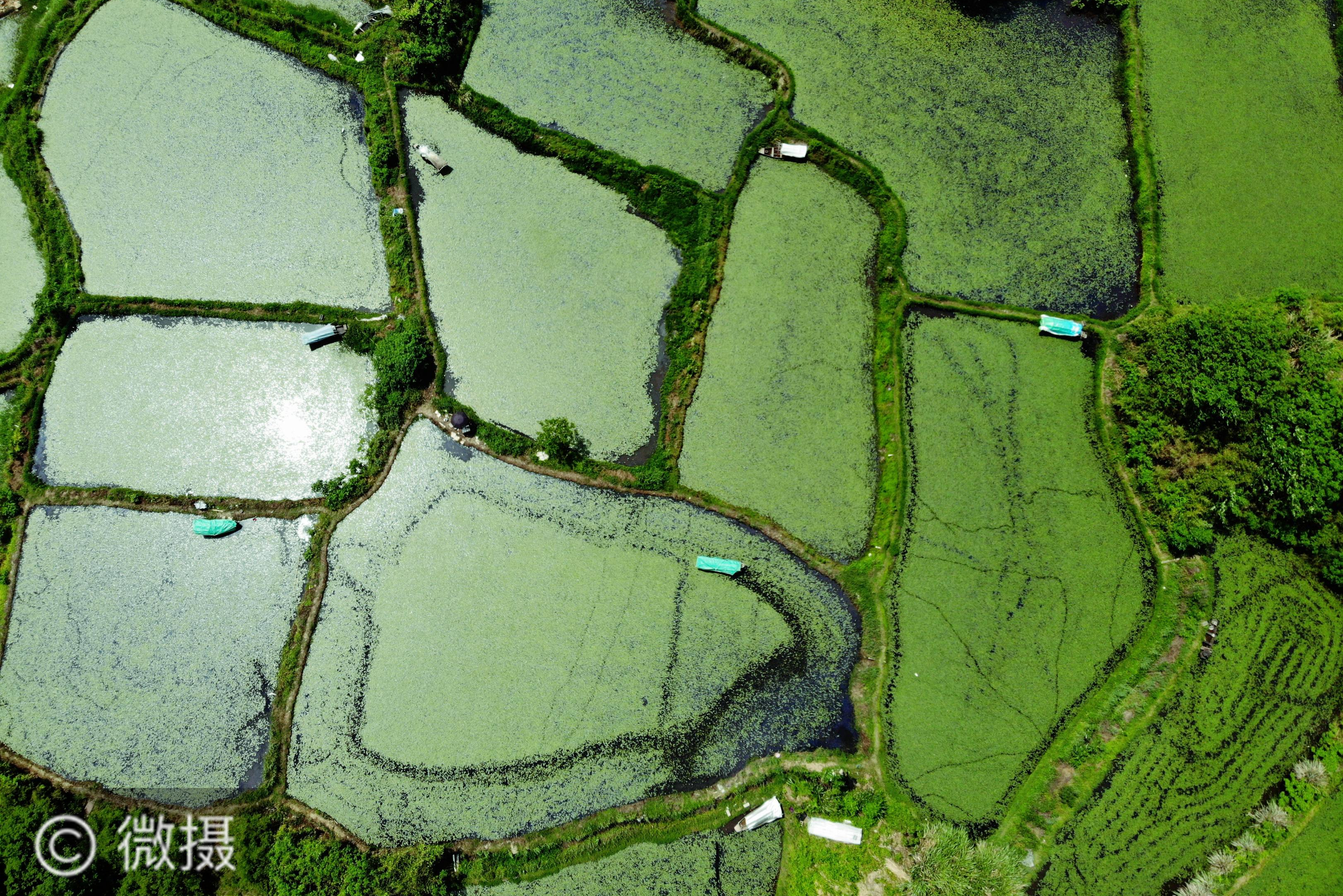 5月13日,村民在杭州西湖区双浦镇湖埠村水塘的小船上采摘西湖莼菜(无人机照片)。近日,杭州西湖区双浦镇湖埠村的西湖莼菜已经进入采摘季。为了及时采摘西湖莼菜嫩芽,村民每天要进行10个小时的劳作。新华社发(龙巍 摄)