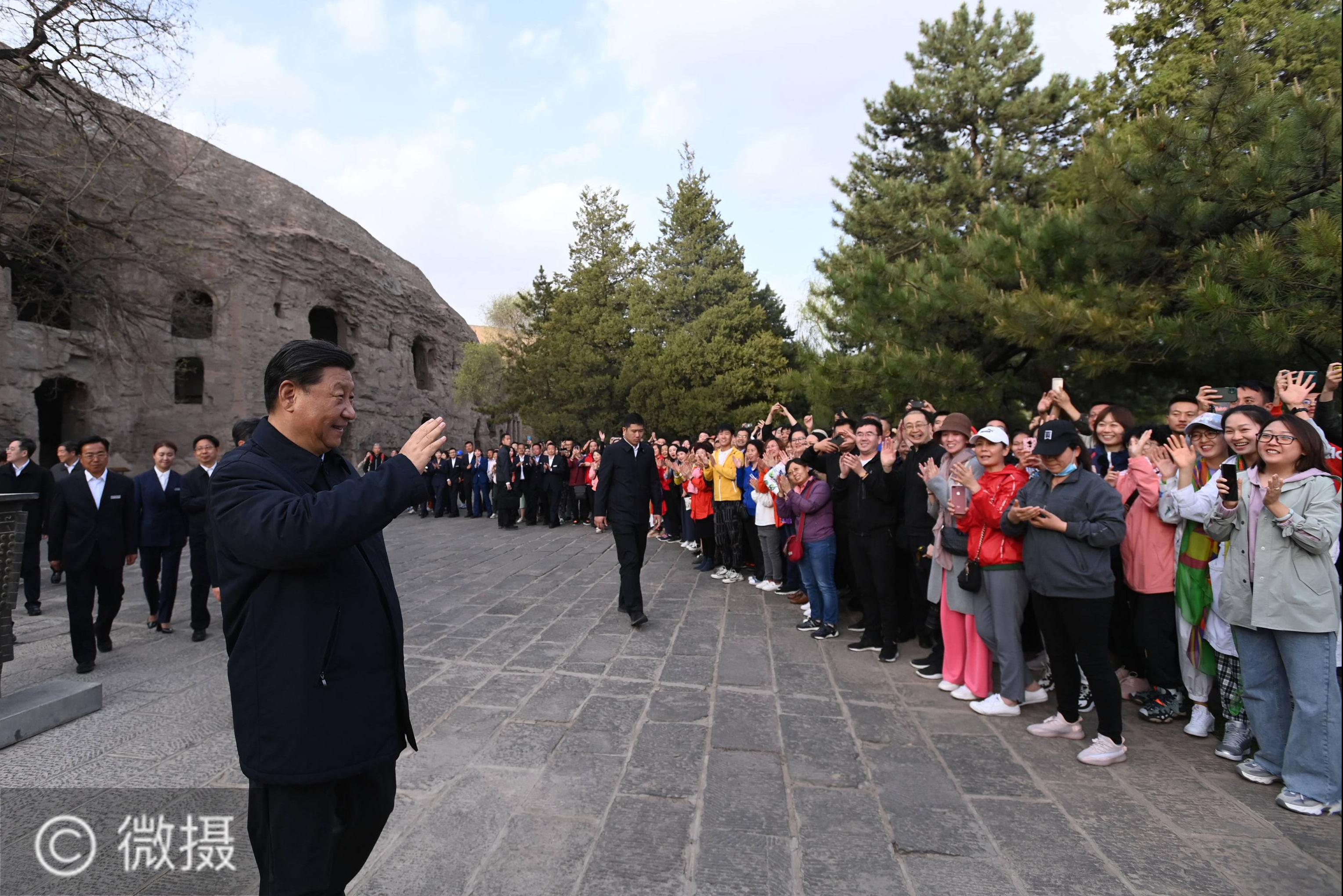 习近平在山西考察。 5月11日至12日,中共中央总书记、国家主席、中央军委主席习近平在山西考察。这是5月11日下午,习近平在大同市云冈石窟考察时,向游客们挥手致意。新华社记者 李学仁 摄